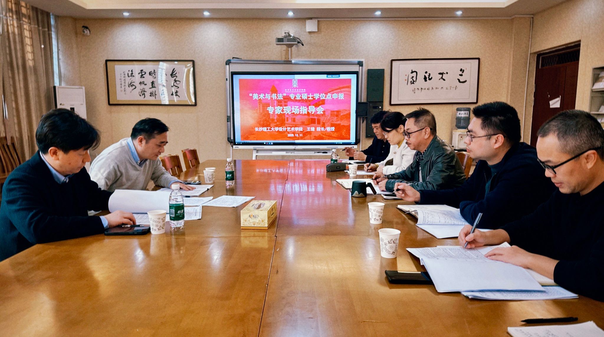 在仔细审阅现有申报材料并听取汇报后,王健教授与王龙副院长对我院在学科建设、师资队伍、艺术创作与实践教学等方面已取得的扎实成果给予了充分肯定。他们指出,学院在“美术与书法”领域已具备较好的积淀与特色,为硕士点的申报奠定了良好基础。针对申报书的进一步优化与提升,两位专家结合多年学科建设与评审经验,提出了极具针对性和建设性的指导意见。与会人员认真聆听了专家意见,并就申报过程中遇到的具体问题与困惑,与专家进行了深入、务实的交流研讨。现场气氛热烈,交流充分。