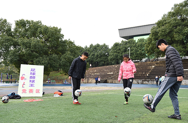 本次活动共设置了篮球投篮王、足球颠球王、跳绳王、呼啦圈王、排球垫球王、踢毽王等6项单项挑战王比赛。来自全校各个学院的近千名同学积极参加到各个单项挑战王的比拼中,比赛现场气氛热烈,高潮迭起,大家在欢乐中进行技能大比拼。足球颠球场地,只见足球在挑战者的脚背上活动自如,极有规律的上起下落,脚背、脚跟、小腿不同部位的颠球,一连串动作毫不拖泥带水;呼啦圈比赛场地,挑战者们坚持不懈高频率不间断的转动着,连场外观战的小朋友都忍不住要体验一把。最终,足球颠球挑战者以600个颠球拔得头筹,呼啦圈挑战者以17000个的成绩赢得冠军,其他项目挑战者以篮球14个,排球239个,踢毽子47个,跳绳1500个取得了各自项目的胜利。