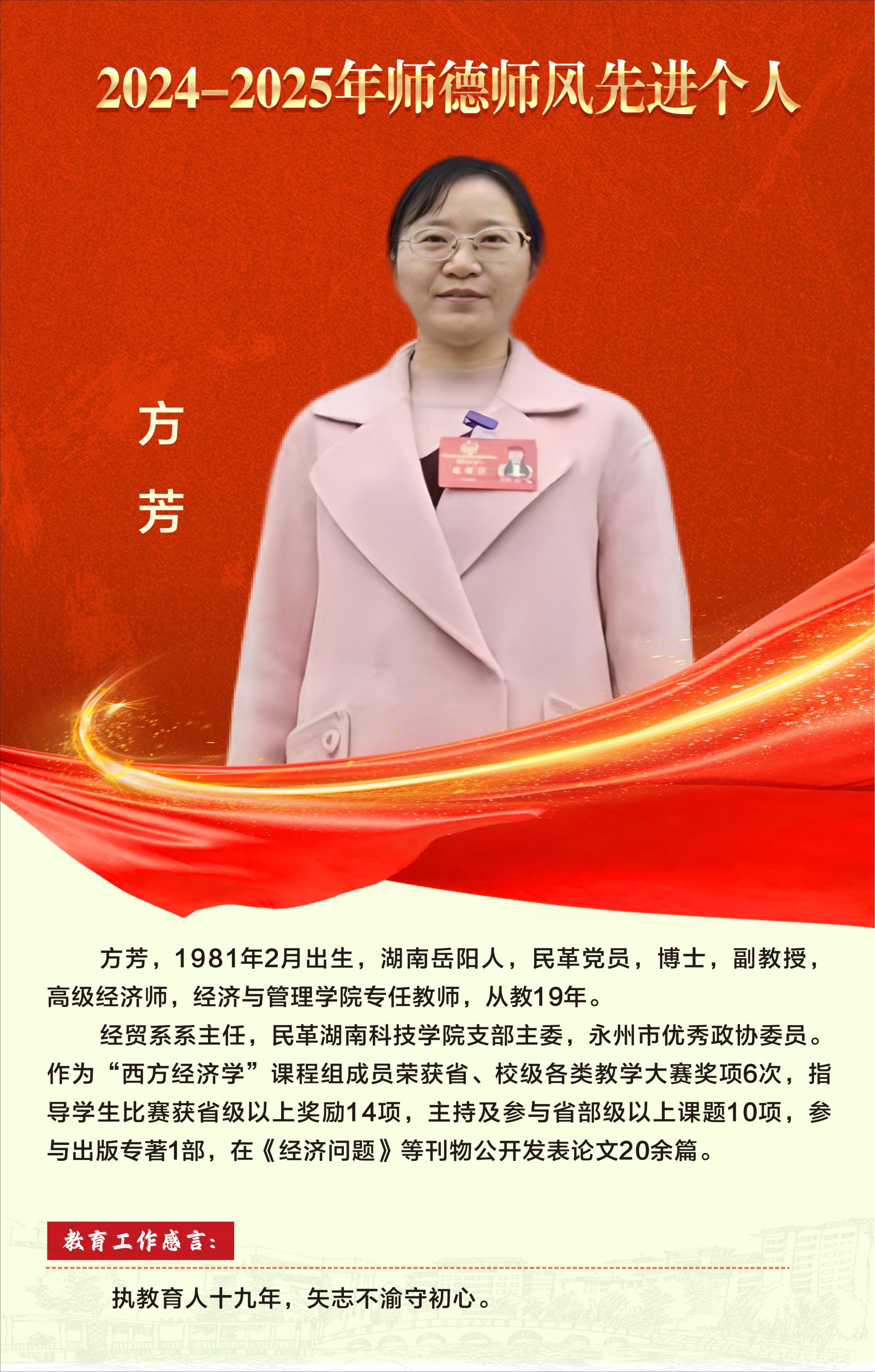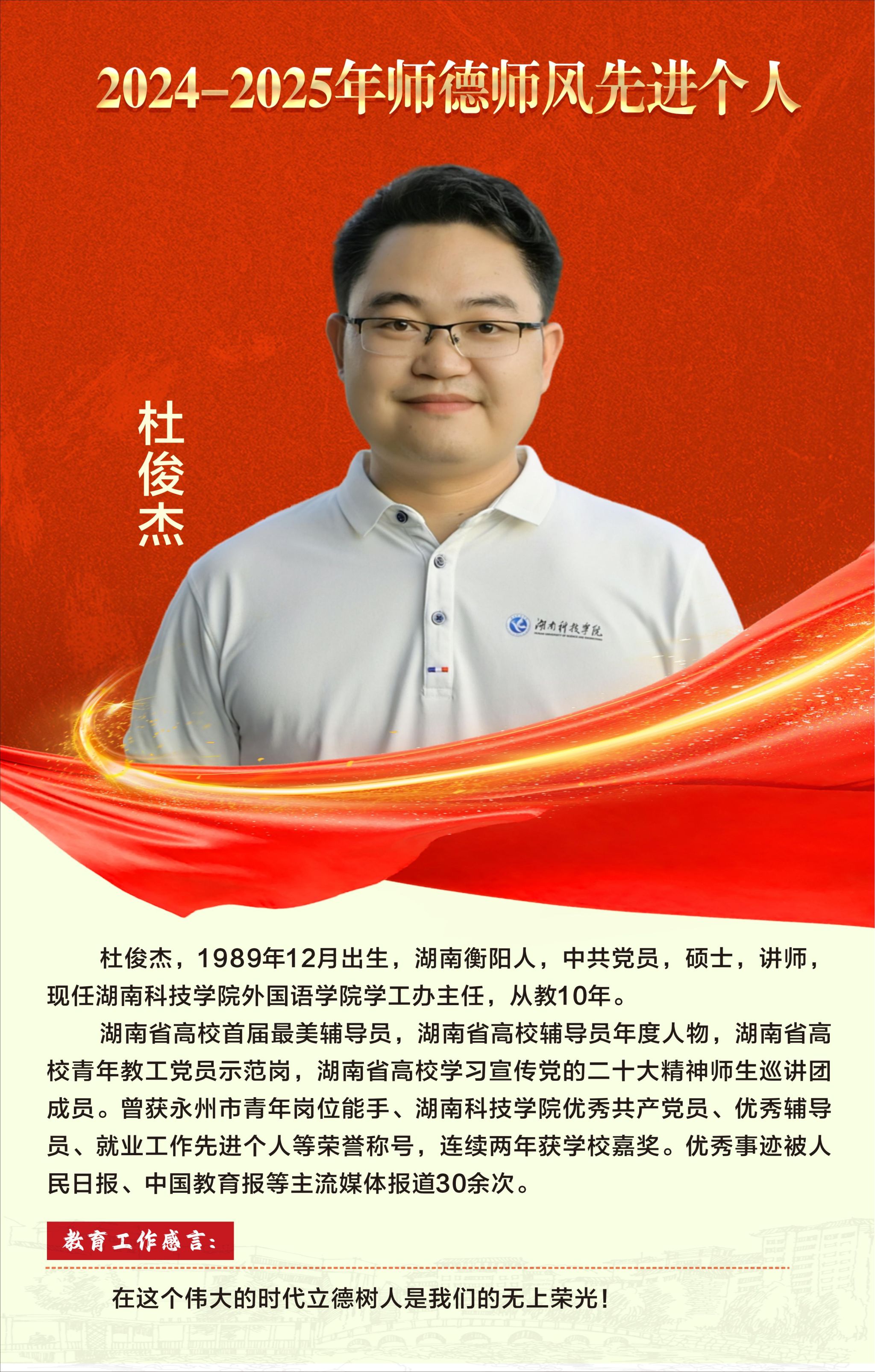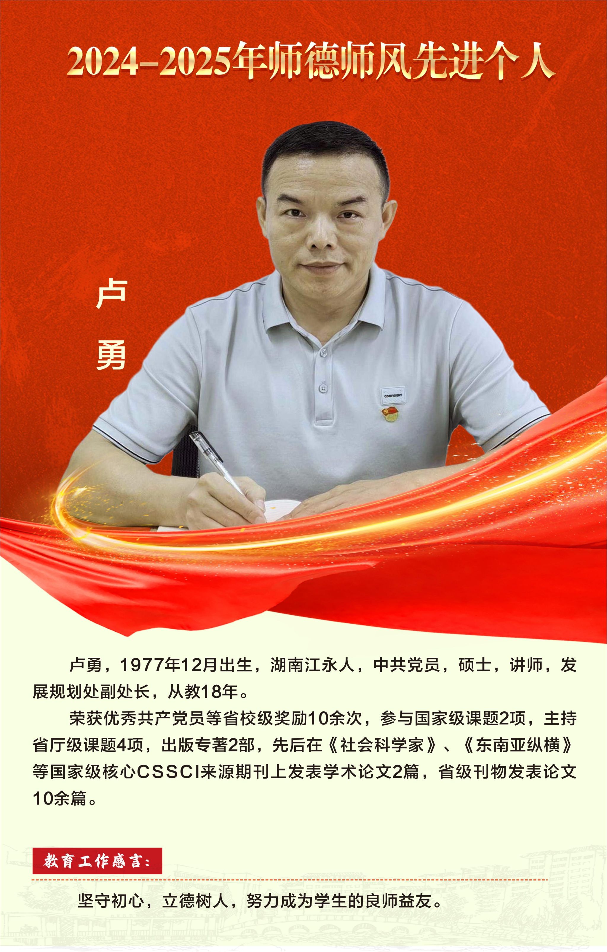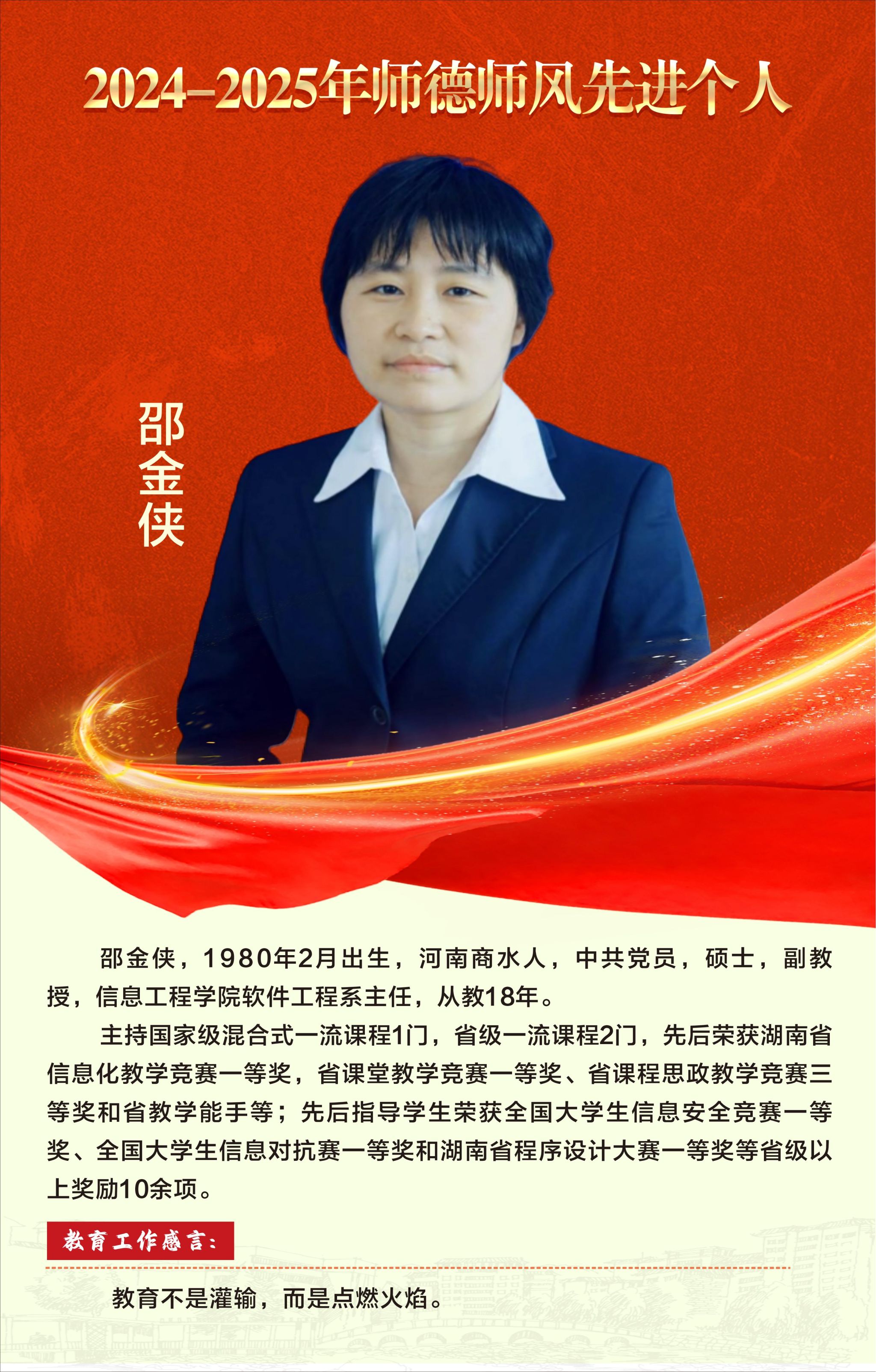 【编者按】:一片丹心育桃李,三尺讲台写春秋。在第41个教师节到来之际,为激励全校广大教师和教育工作者落实立德树人根本任务,积极投身教育强国建设,校园网特别开辟“弘扬教育家精神”专题栏目,营造尊师重教浓厚氛围,展现学校优秀教师风采,讲述教书育人暖心故事。