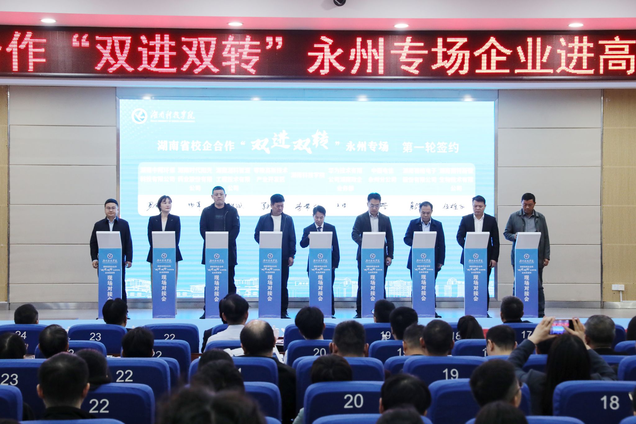 2025年10月,我校举行湖南省校企合作“双进双转”企业进高校现场对接活动永州专场,与湖南中稀环保科技有限公司等16家企事业单位签订产学研合作协议。