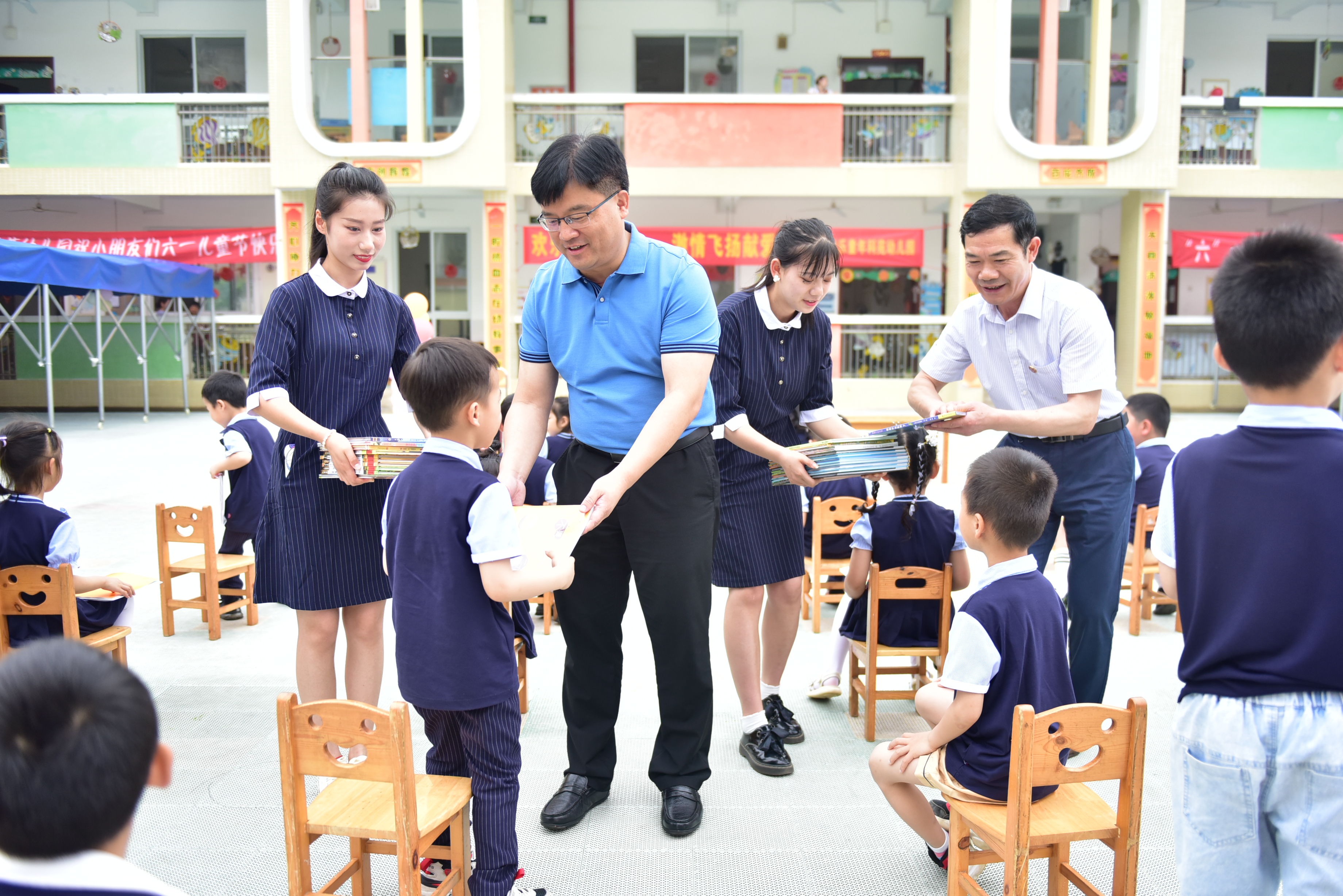 在幼儿园操场,小朋友们正在欢唱儿歌,欢声笑语不断。李钢、吴小林走到小朋友们中间,和他们交流互动,给每一个小朋友送上精美的绘本。