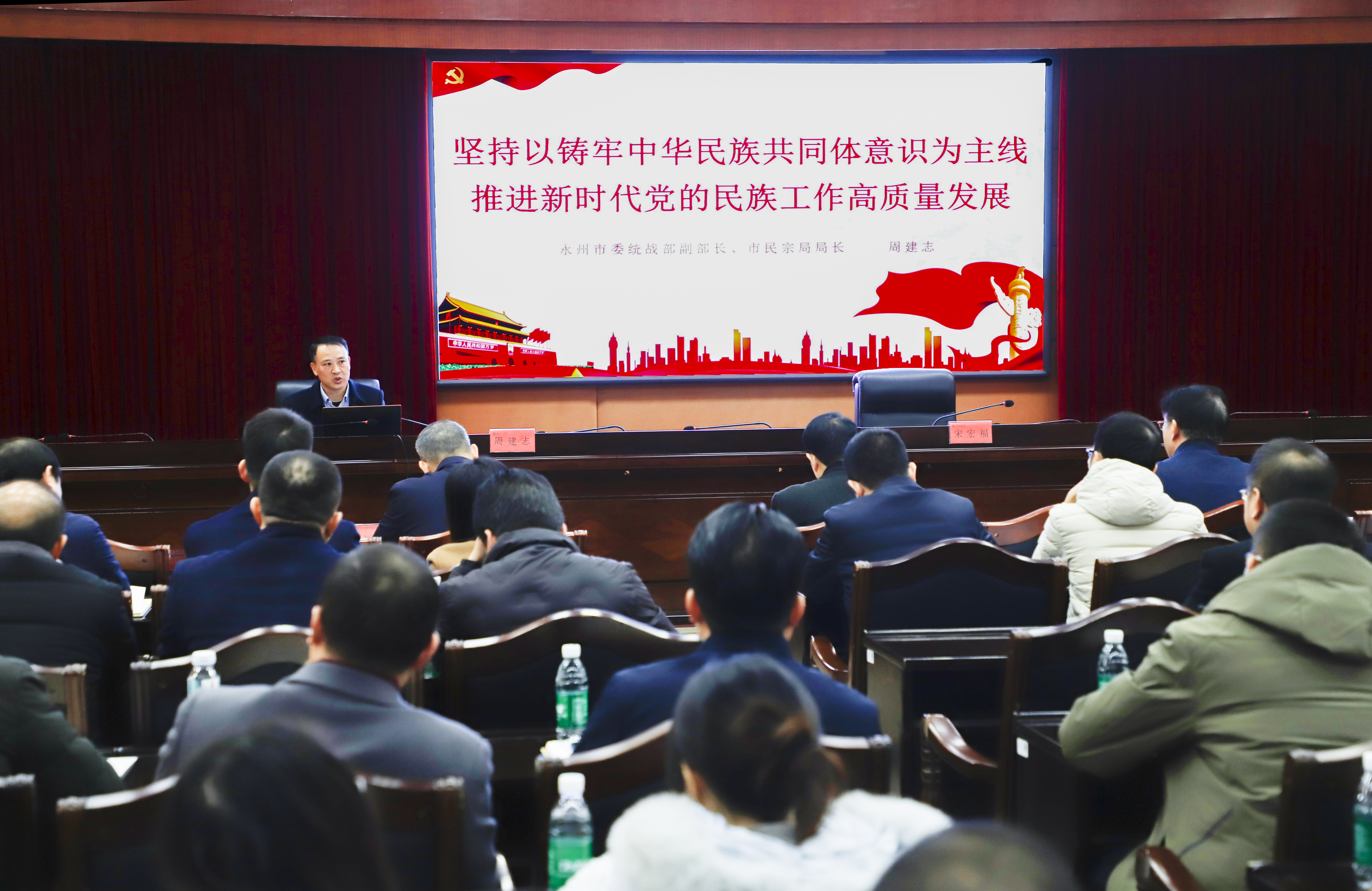 永州市委统战部副部长、市民宗局局长周建志作题为《坚持以铸牢中华民族共同体意识为主线 推进新时代党的民族工作高质量发展》,他从历史方位、时代之问、百年变局三个方面深入浅出的阐述了铸牢中华民族共同体意识的重要意义。他指出,铸牢中华民族共同体意识要坚持辩证思维,牢固树立当代中国民族关系自信;要坚持求同存异,铸牢中华民族共同体意识;要坚持求同化异,加强各民族交流交往交融;要坚持求同求异,创新民族工作体制机制。