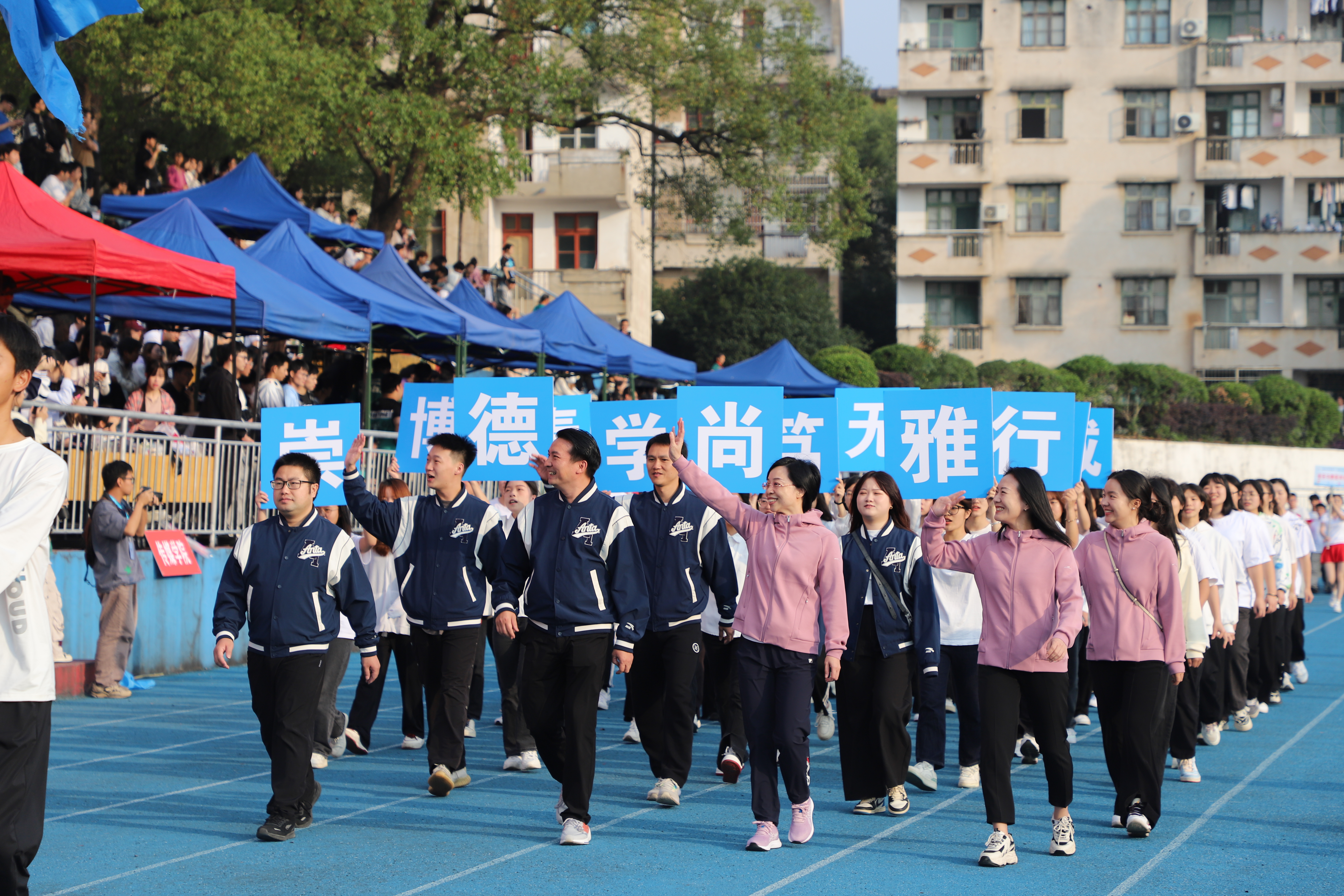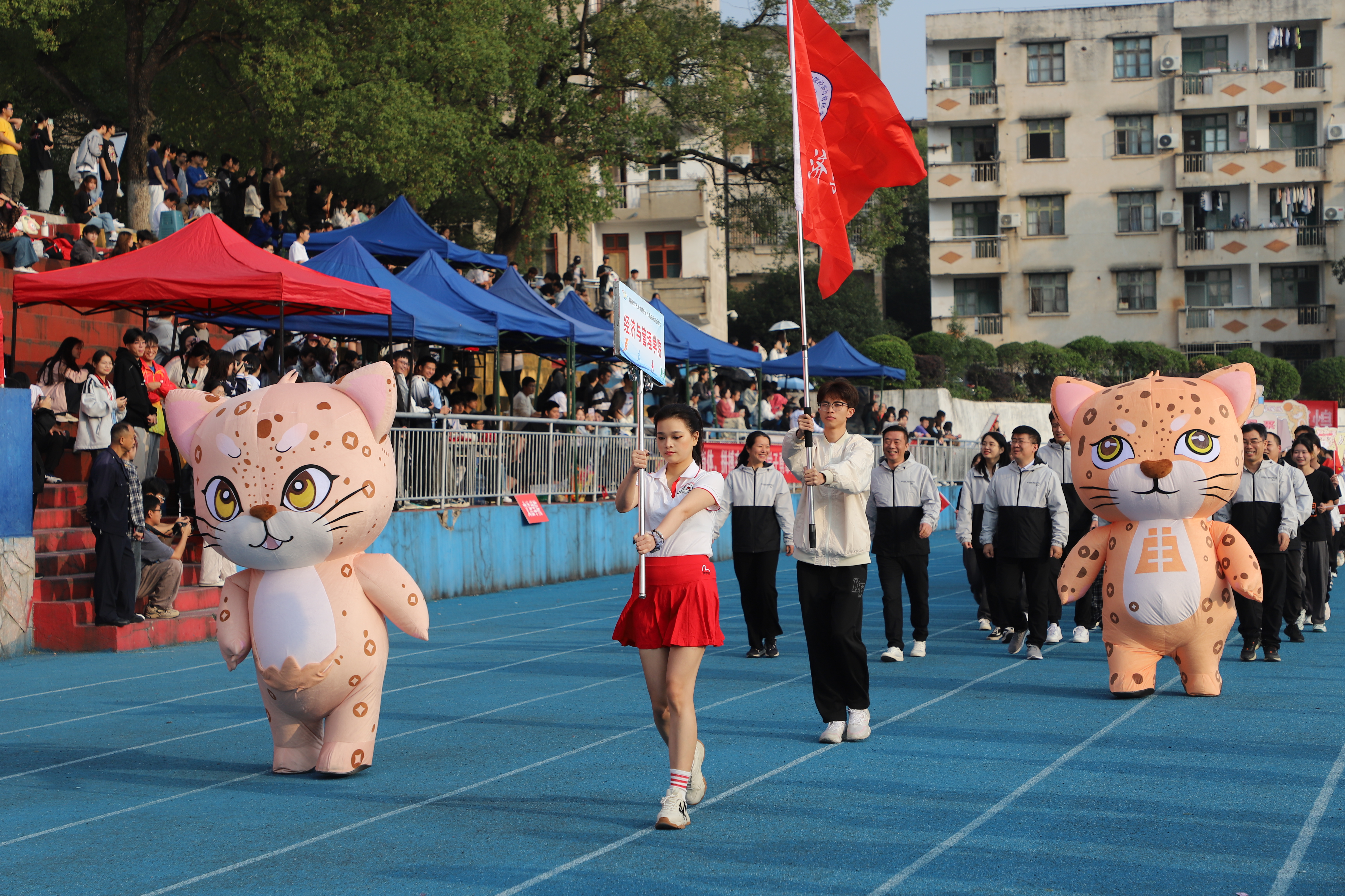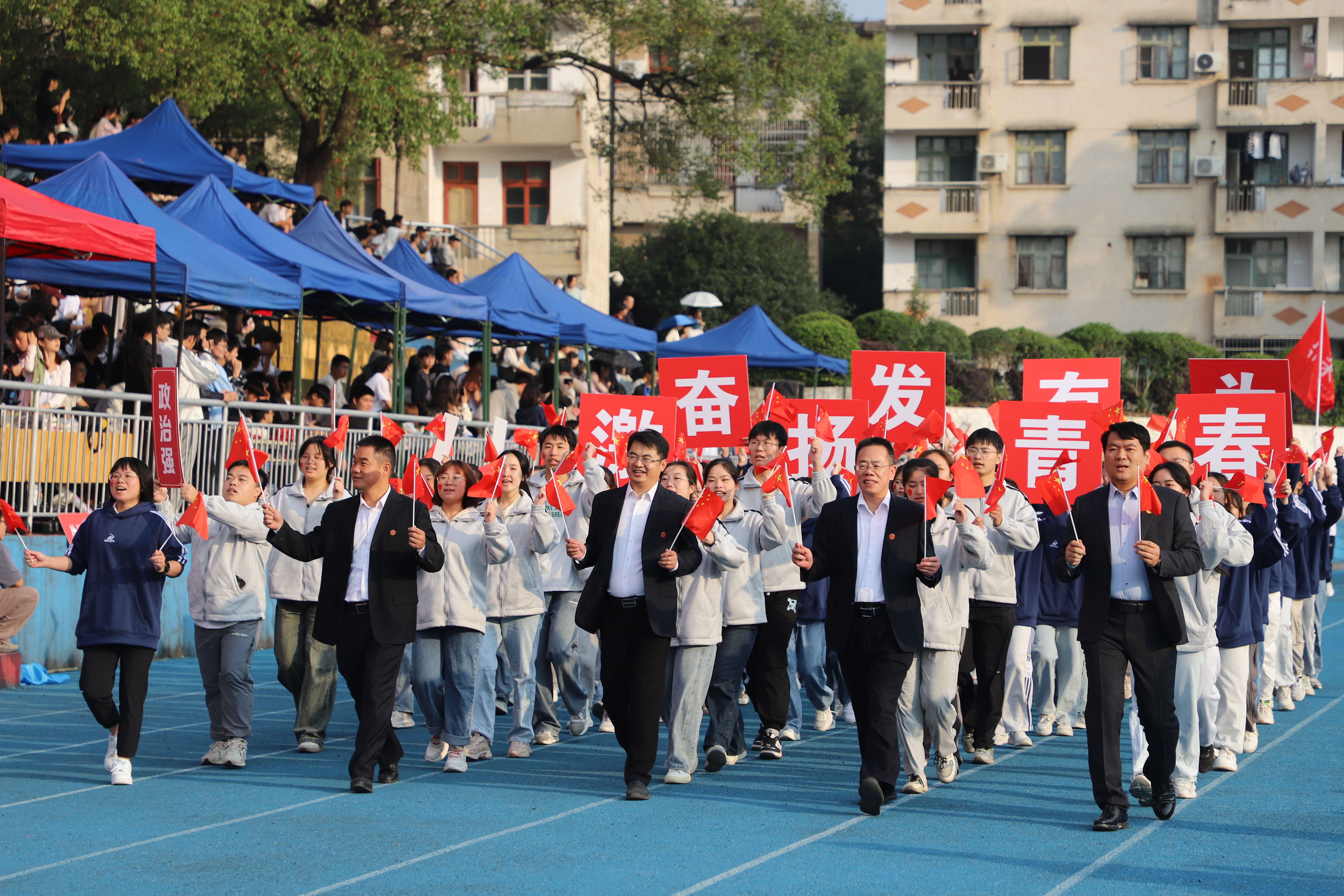伴随着激昂的运动进行曲,十二位护旗手高擎五星红旗、校旗和运动会会旗,步伐矫健、眼神坚定,彰显着科院学子的信仰与力量。紧随而来的是表演方阵,团结向上的标语、别出心裁的展板、舞动的鲜艳花束和迎风飘扬的气球,欢快的旋律谱写着青春的诗篇。裁判员方阵、各学院运动员代表队依次入场。他们昂首挺胸,每一个步子都踏着坚毅;他们英姿勃发,每一声口号都饱含朝气,整齐协调的队伍、响亮有力的口号展示着我校师生昂扬向上的精神风貌和争创佳绩的进取决心。