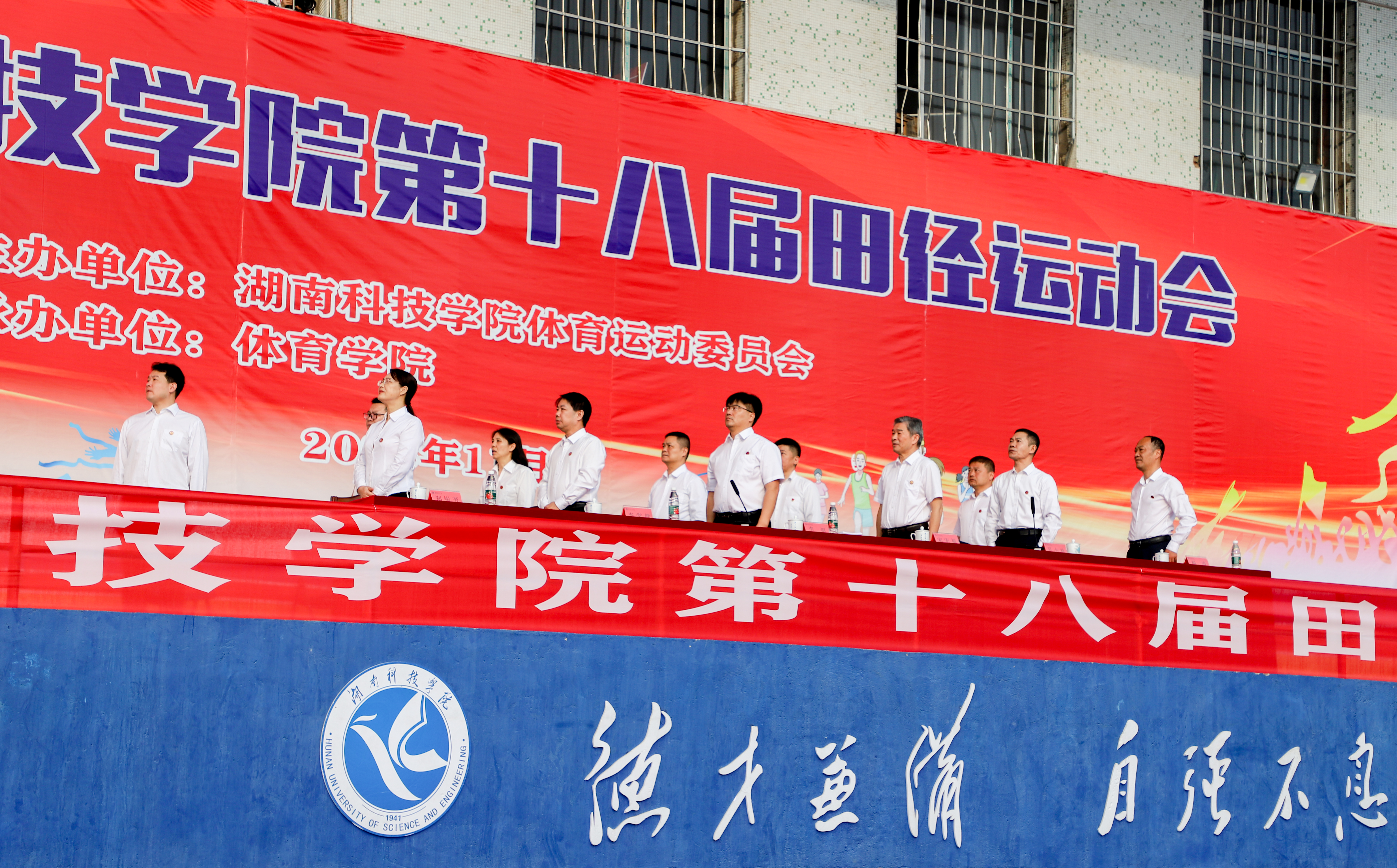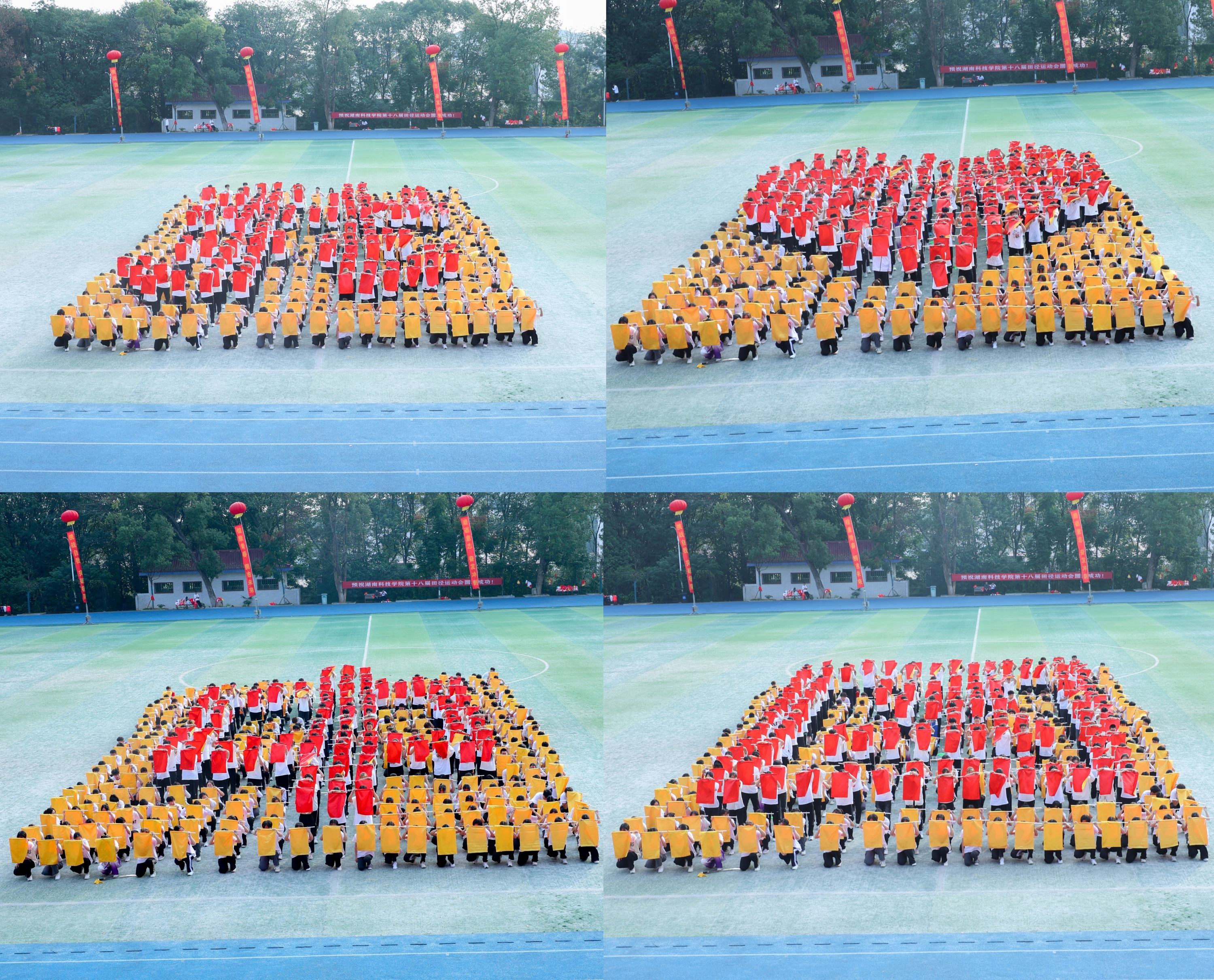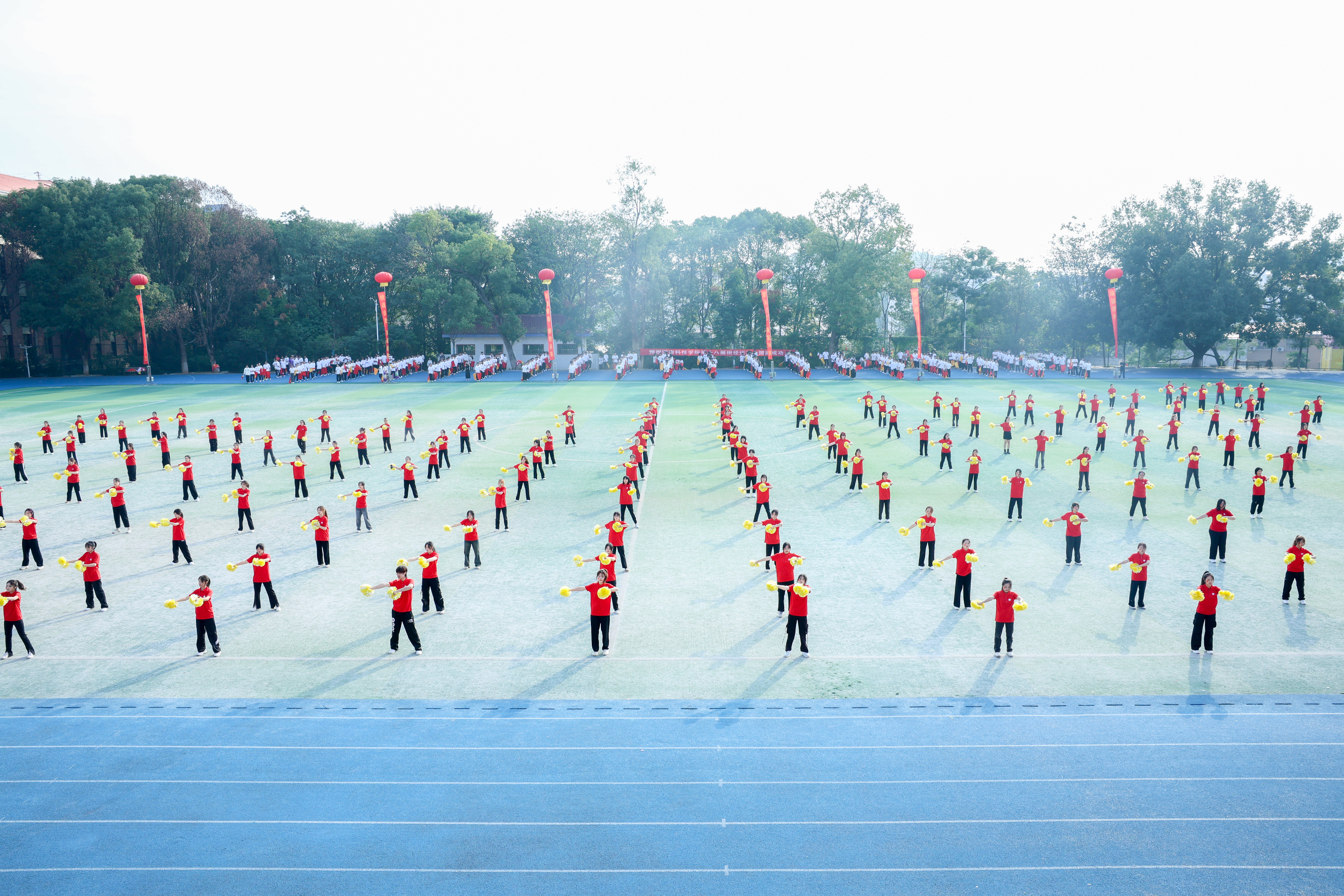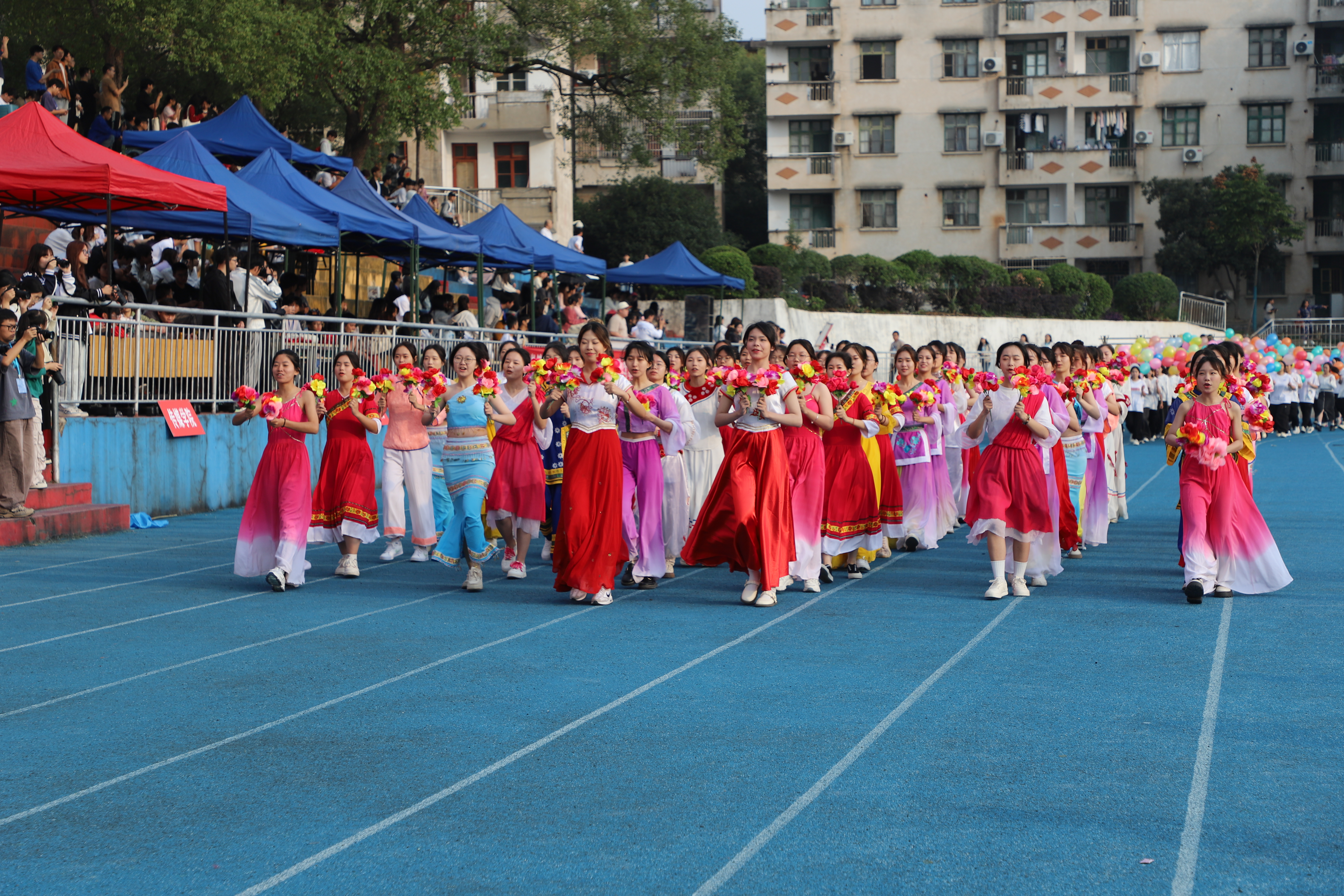 伴随着激昂的运动进行曲,十二位护旗手高擎五星红旗、校旗和运动会会旗,步伐矫健、眼神坚定,彰显着科院学子的信仰与力量。紧随而来的是表演方阵,团结向上的标语、别出心裁的展板、舞动的鲜艳花束和迎风飘扬的气球,欢快的旋律谱写着青春的诗篇。裁判员方阵、各学院运动员代表队依次入场。他们昂首挺胸,每一个步子都踏着坚毅;他们英姿勃发,每一声口号都饱含朝气,整齐协调的队伍、响亮有力的口号展示着我校师生昂扬向上的精神风貌和争创佳绩的进取决心。