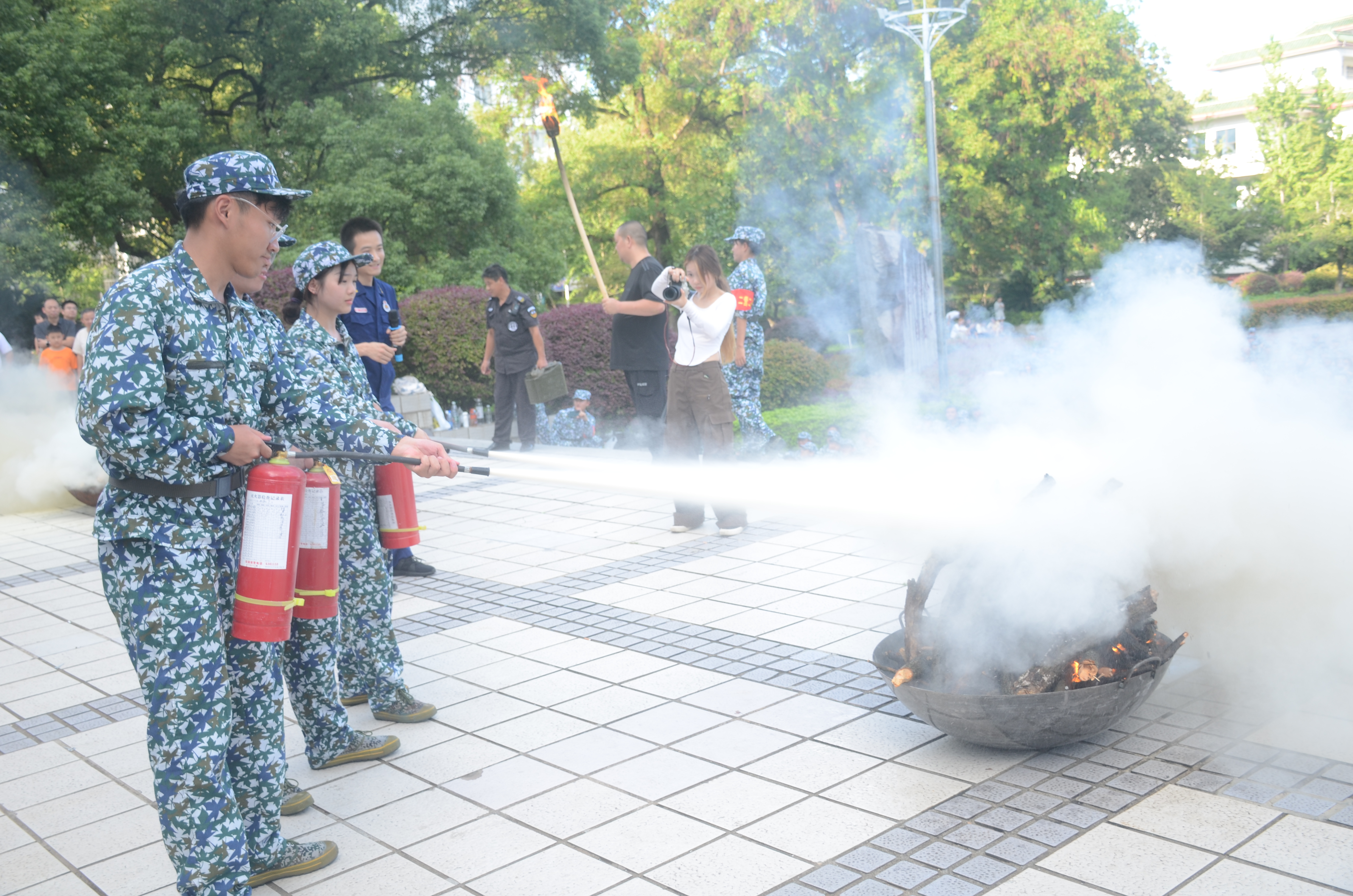 应急疏散完毕之后,零陵区消防救援大队向2023级新生讲解抢险救灾器材装备的性能、用途及现场操作,详细介绍了“液化气泄露应急方法”、“如何扑灭初期火灾”、“火灾安全疏散逃生”等消防安全知识,指导实操灭火器环节吸引了不少同学踊跃参与体验。