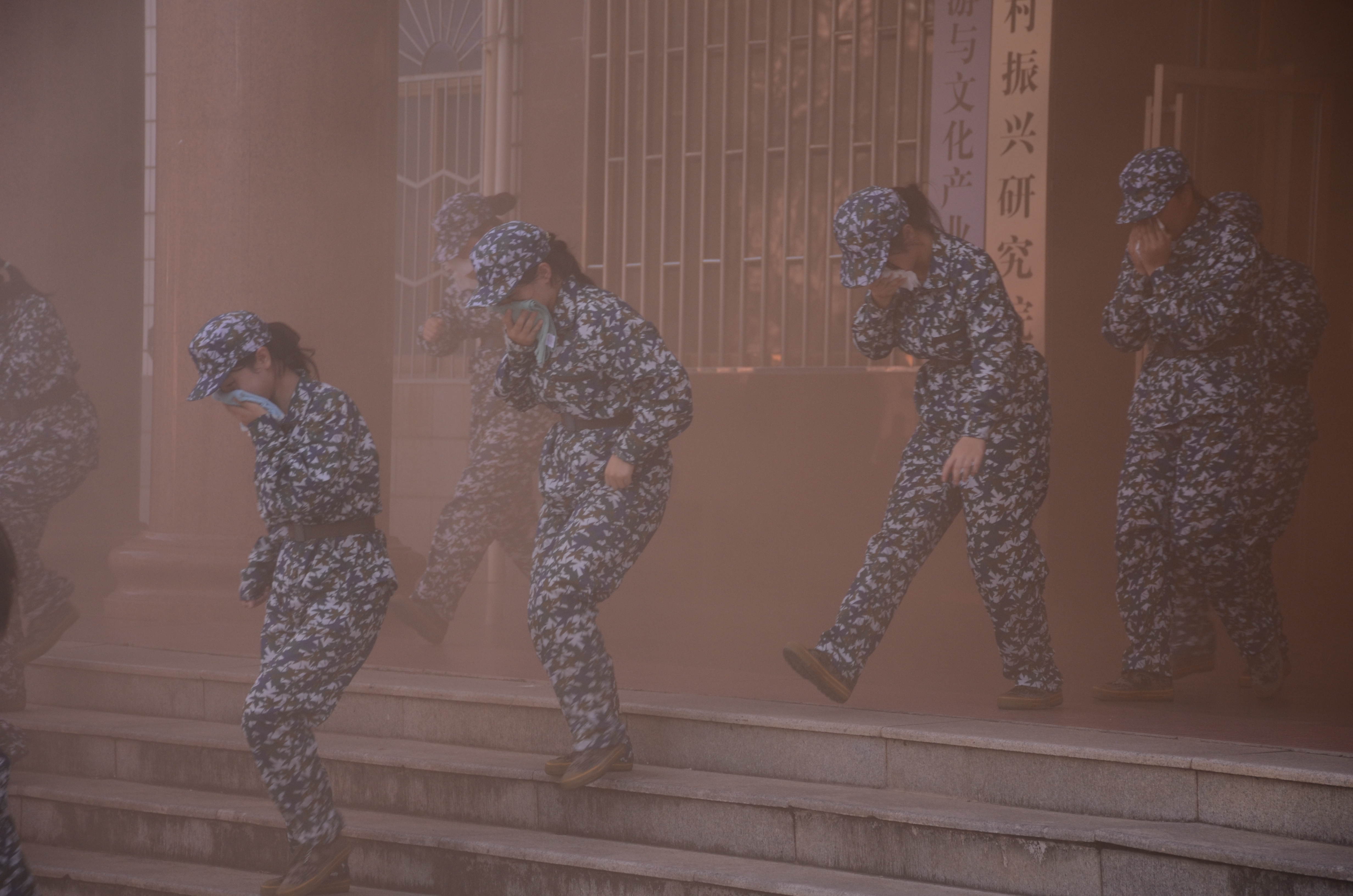 下午4时,消防疏散应急演练正式开始,现场模拟弘毅楼内发生火灾。弘毅楼教室出现橙棕色浓烟,随即一阵急促的警报声响起,浓烟迅速蔓延,整栋楼烟雾滚滚。火情一经发现,保卫处立即组织人员赶赴各楼层进行应急疏散并拨打119火警电话,应急救护组人员在一旁待命,随时准备急救。不到一分钟的时间,只见被困学生从所在楼层的两边沿中间楼梯移动,用衣物或沾满水的湿毛巾、手帕等捂住口鼻,低弯着腰,匍匐前进,有序下楼,紧急疏散撤离至文化广场。与此同时,消防大队顺利到达现场,迅速实施营救,所有被困学生顺利脱险。