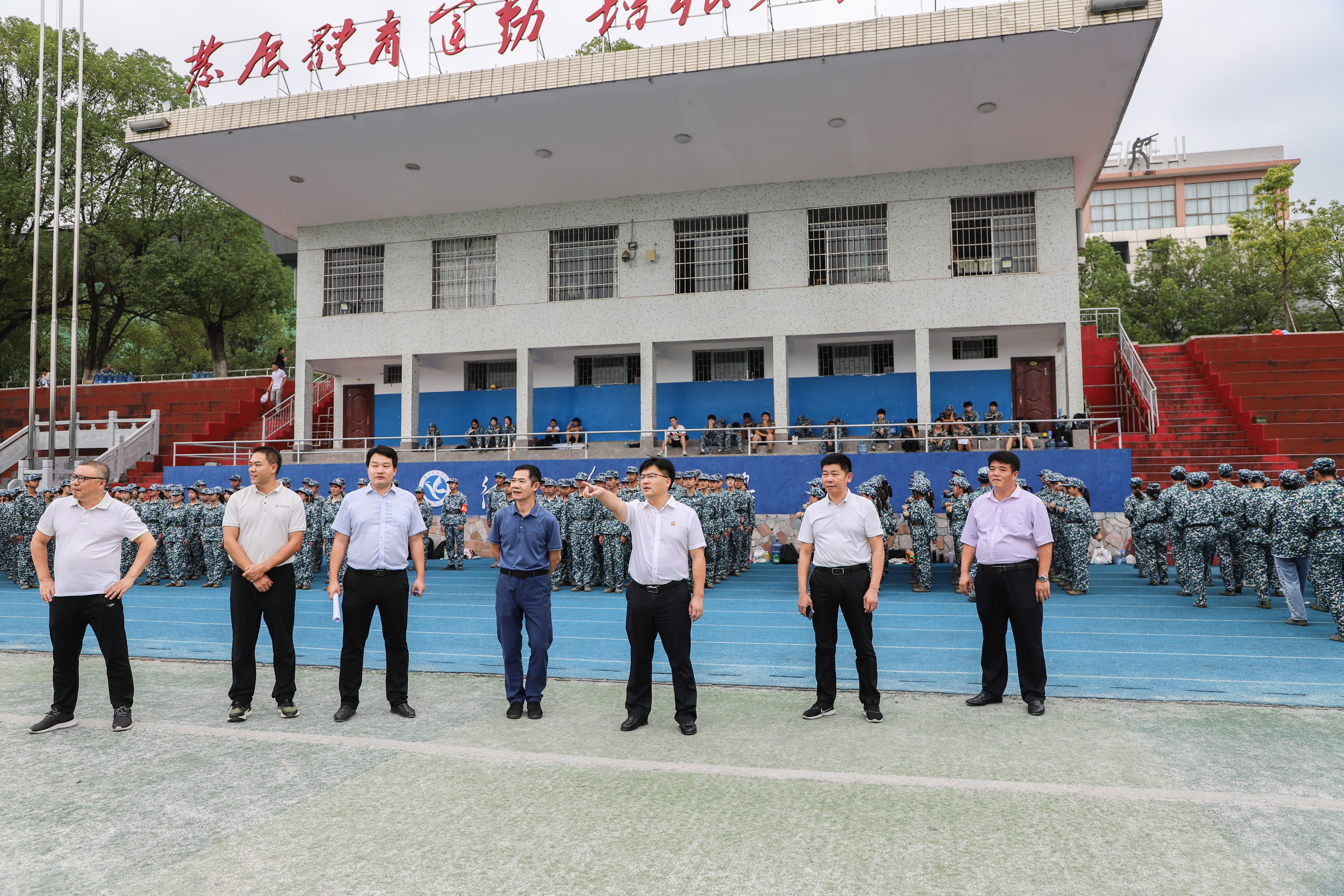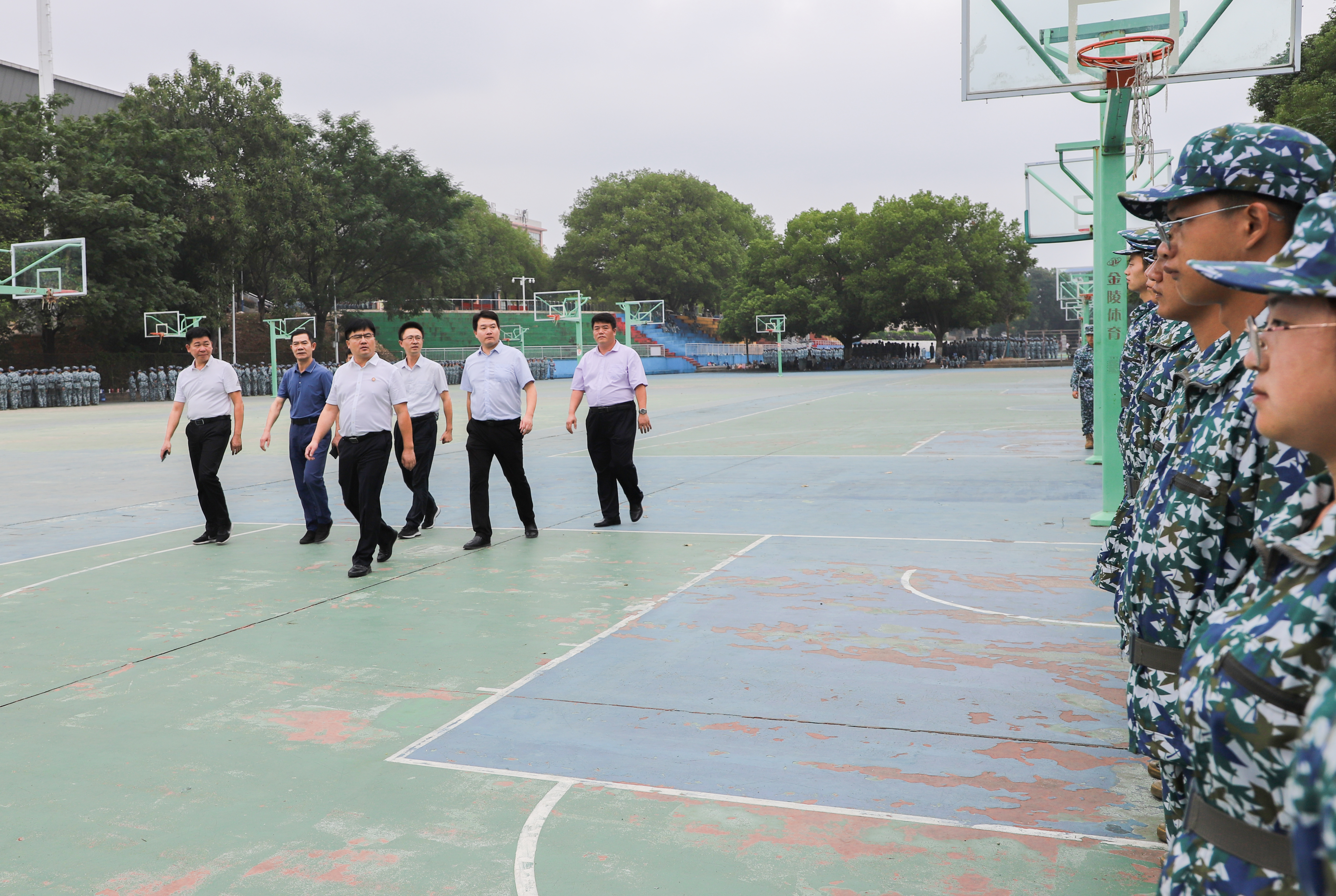 本网讯 军姿彰显意志,汗水挥洒青春。学校2023级新生军训正如火如荼地进行,一抹抹橄榄绿为校园增添了一道亮丽的风景。9月21日下午,党委书记李钢,副校长吴小林一行深入军训场地检查指导军训工作,看望慰问2023级军训新生。