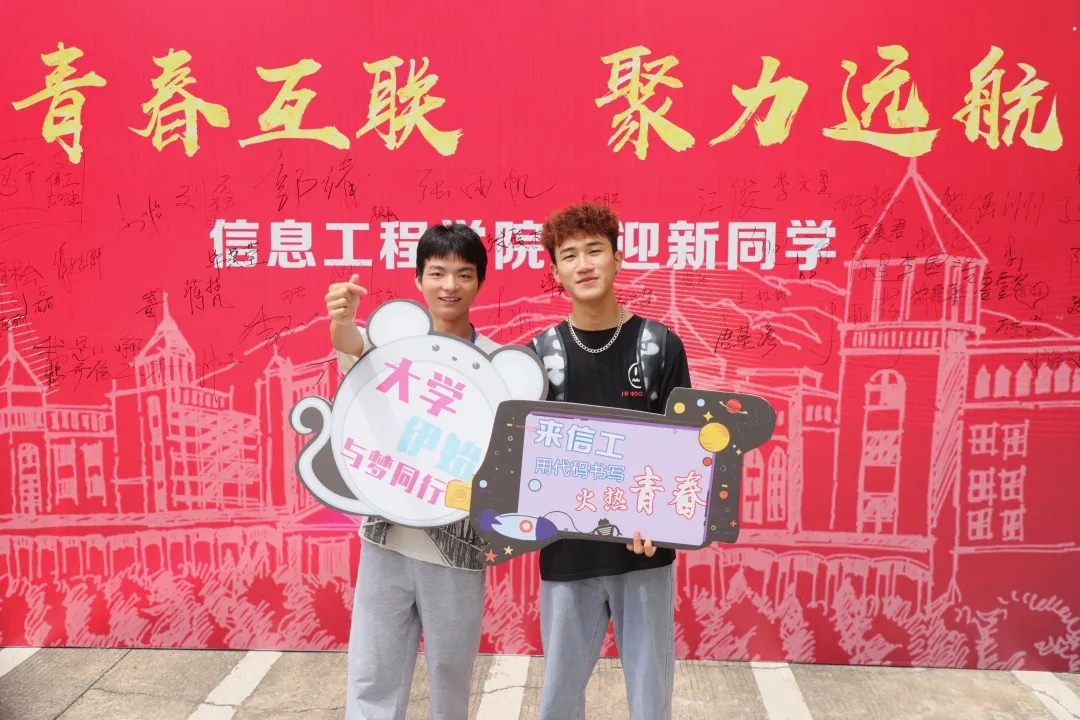 “我在这里等你好久啦”“接过你的行李,我们就是一家人!”“团团拍了拍你并说‘欢迎你’”……校园内各种特色标语以及立牌成为学校新晋打卡点,引得不少新生及新生家长驻足合影留念。标语和立牌不仅仅是一个富有创意的装饰,更是一个传递爱与祝福的媒介。