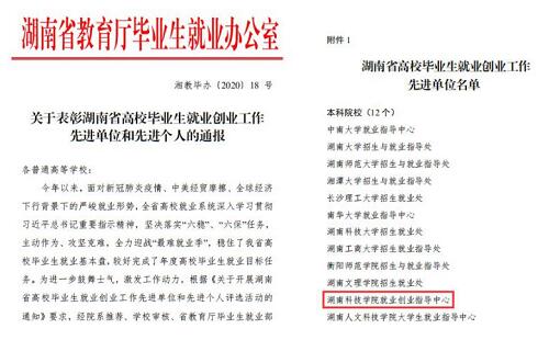本网讯 近日,根据湖南省教育厅毕业生就业办公室《关于表彰湖南省高校毕业生就业创业工作先进单位和先进个人的通报》(湘教毕办〔2020〕18号),我校就业创业指导中心被评为“湖南省高校毕业生就业创业工作先进单位”,全省仅12所本科院校获此殊荣,张俭民、胡清华、肖可、高鹏等4人被评为“湖南省高校毕业生就业创业工作先进个人”。