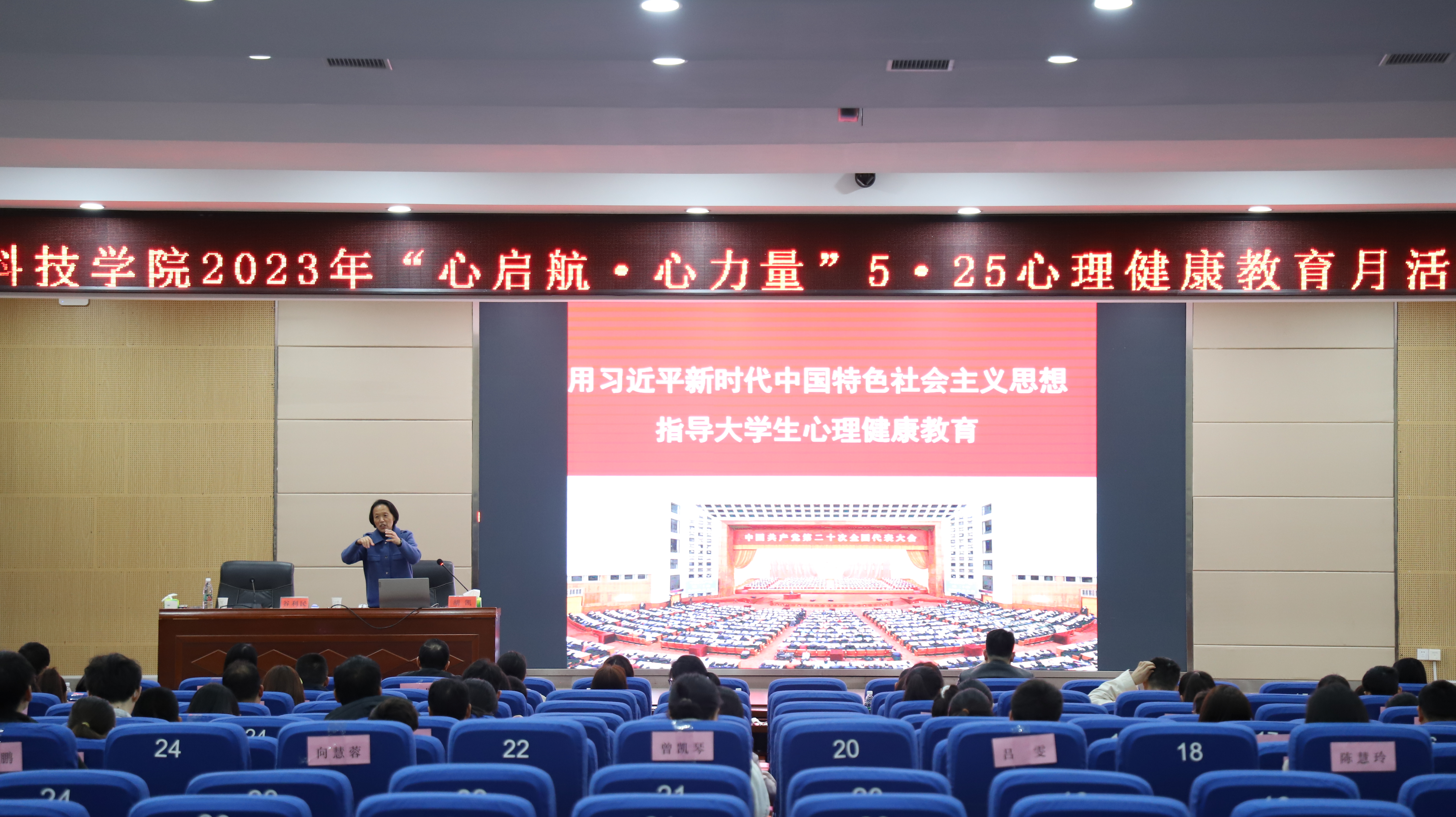 本网讯 4月25日,学校在潇湘大讲堂举行“深学笃行二十大,踔厉奋发新征程”——2023年“心启航·心力量”5·25心理健康教育月专题培训,邀请中南大学博士生导师胡凯教授和湖南师范大学博士生导师陈杰教授作了专题报告。湖南省高校心理健康教育示范中心对口协作单位永州职业技术学院、湖南九嶷职业技术学院、永州师范高等专科学校及我校的全体专职心理咨询师和辅导员参加本次专题培训。讲座由学工部部长谷利民主持。