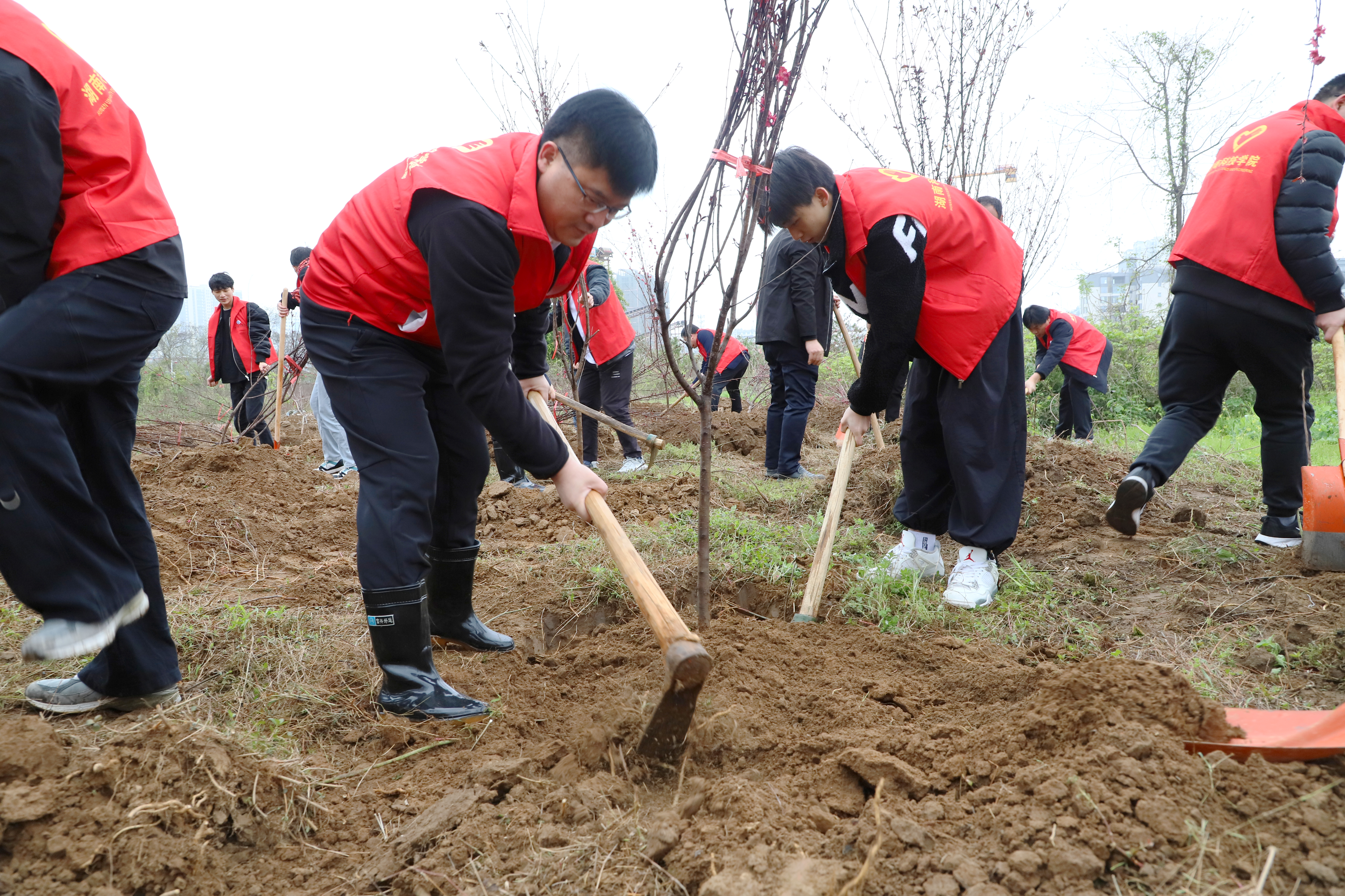 挖坑、植苗、填土、浇水……在茆江桥社区,校领导和师生们纷纷撸起袖子栽种树苗,为美丽永州种下一株绿色,增添一份绿意。分配好铲子和水桶等劳动工具后,大家按照树苗栽植的每道工序,合力种下一棵棵桃树,热情高涨,干劲十足,一番热火朝天的忙碌之后,共种植桃树40余株。新栽植的树苗整齐排列,昂然挺立,昂然挺立,萌发出盎然生机。