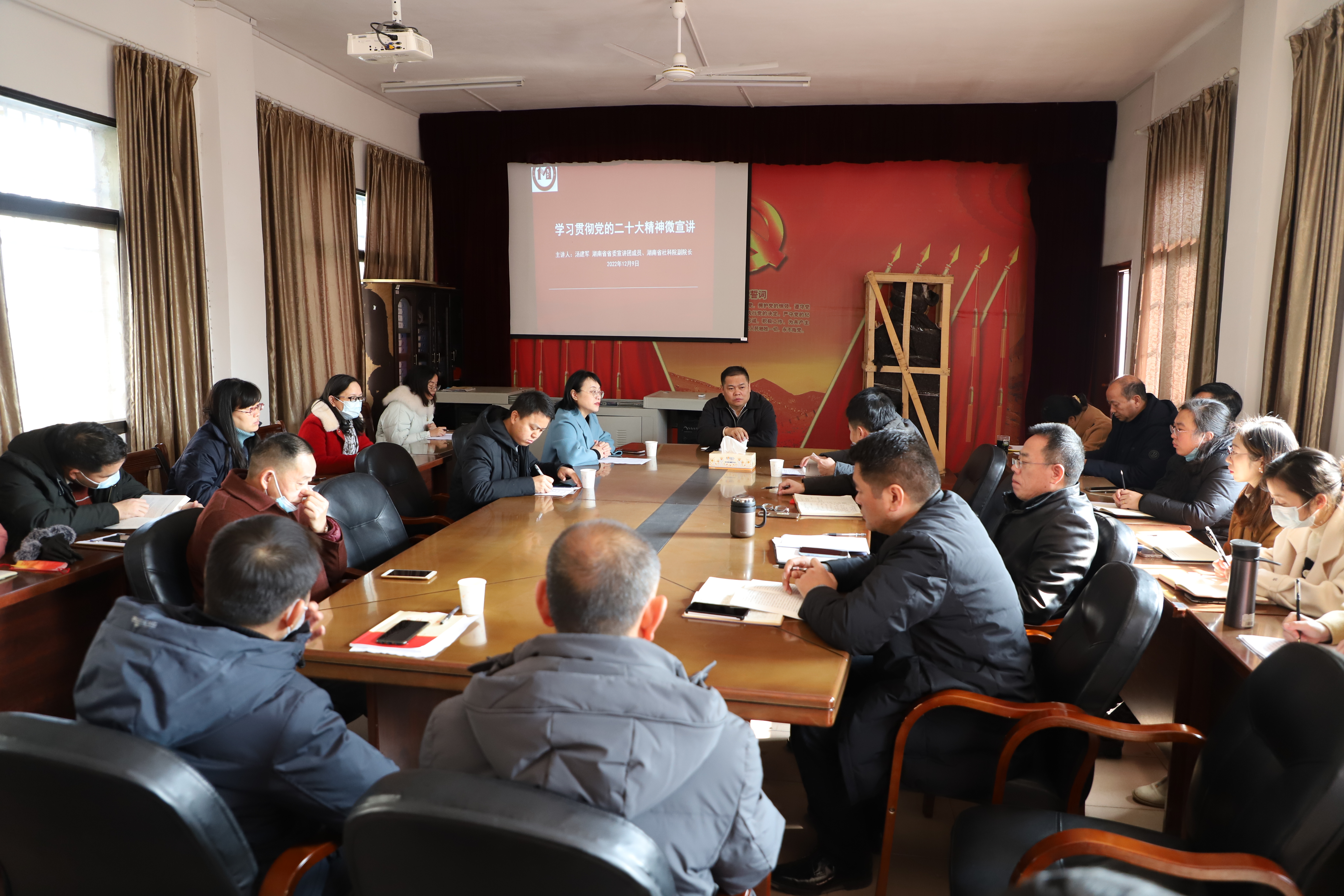 汤建军从全面领会党的二十大的主题及主要成果、深刻认识新时代十年的伟大变革及其里程碑意义、不断开辟马克思主义中国化时代化新境界、牢牢把握新时代新征程中国共产党的使命任务、贯彻落实新时代新征程的战略部署、用新的伟大奋斗创造新的伟业等方面,对党的二十大精神进行了系统阐释和深入解读。与会人员仔细聆听、认真记录,认为宣讲报告紧扣实际、内容丰富,听后深受启发。