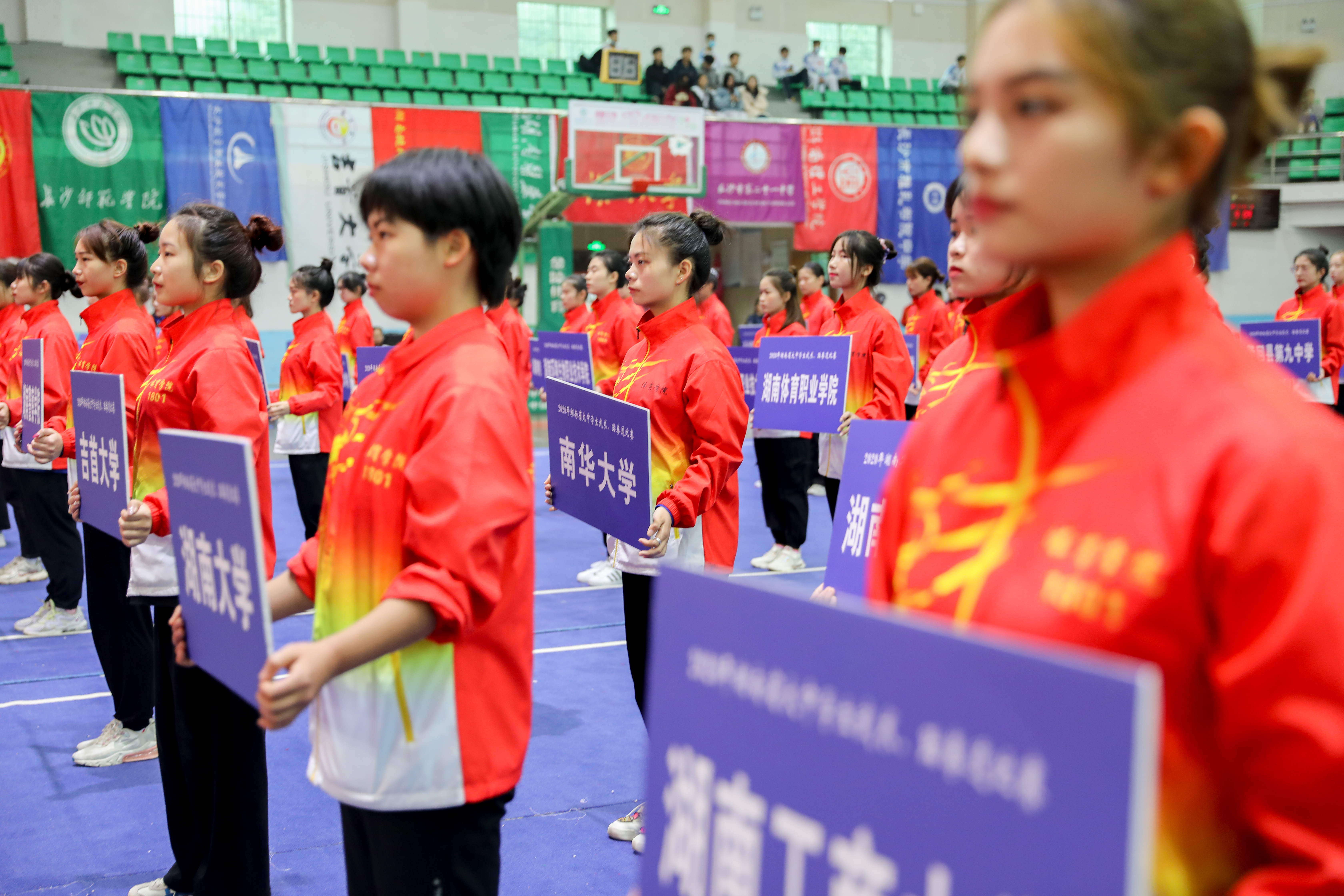 本网讯(记者 陈斯静 实习记者 陈丽杰)11月21日上午,2020年湖南省大中学生武术、跆拳道比赛在我校开幕,来自全省70所大中学校的94支代表队894名运动员参加。