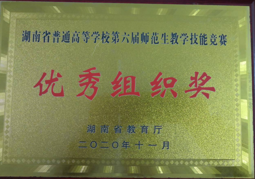 本网讯 11月21日,湖南省高校第六届师范生教学技能竞赛落下帷幕。我校选派的5名选手全部获奖。其中,理学院数学1702班杨学凤同学荣获中学理科组一等奖,物理1802班谢涛玲同学荣获中学理科组二等奖;化学与生物工程学院化学1702班郑婷同学荣获中学理科组三等奖;外国语学院英语1802班郑伊然同学、刘建辉同学分别荣获中学文科组三等奖。学校荣获优秀组织奖。