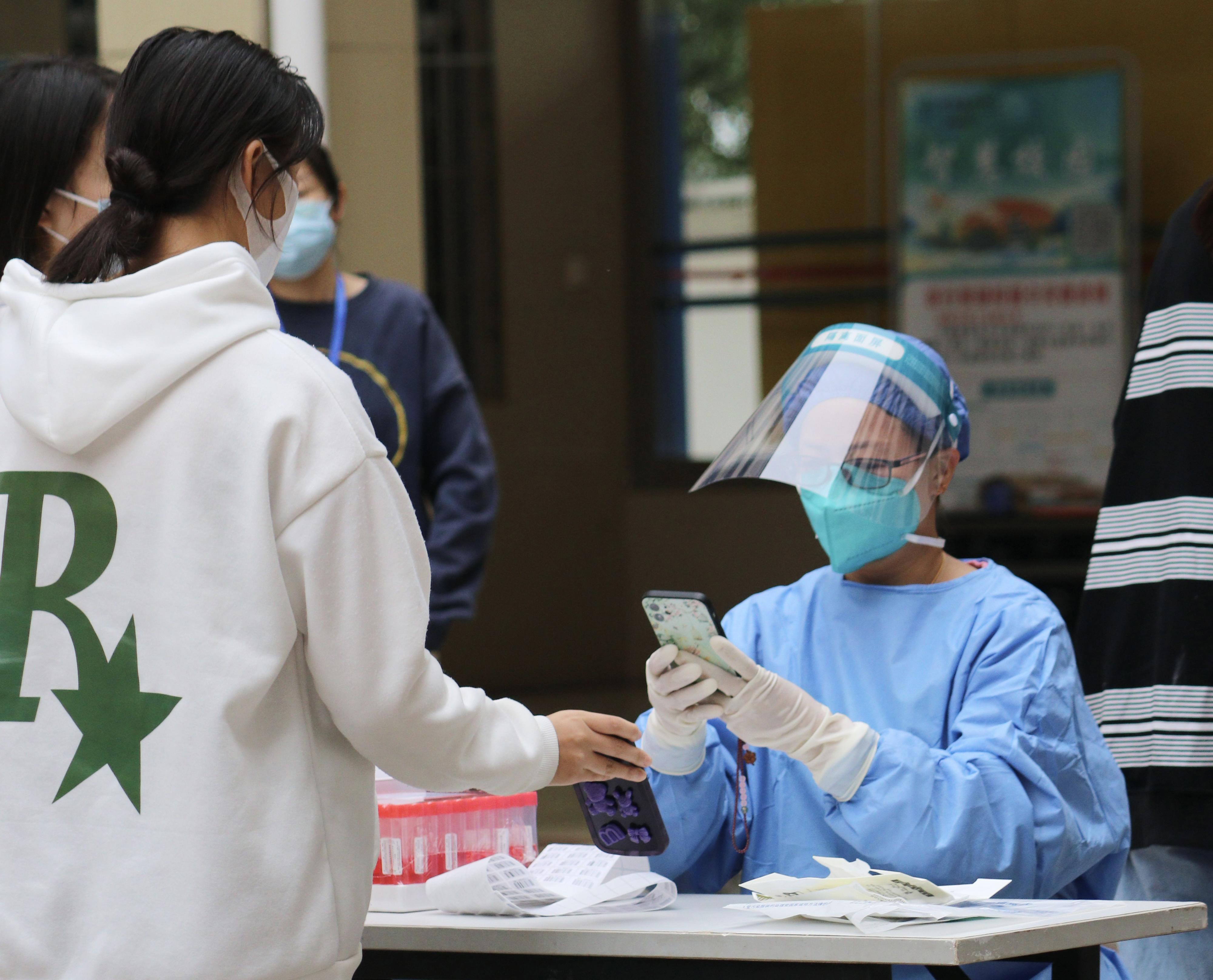 作为志愿者的秘书2002班李雨阳激动地说:“参加了很多次核酸检测,第一次成为工作人员,很荣幸能为学校贡献一份力量!”