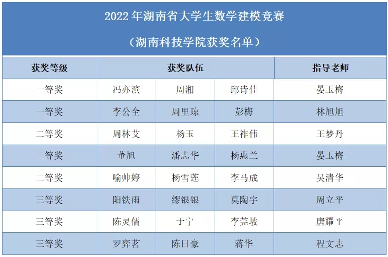 本网讯 近日,由湖南省教育厅主办的2022年湖南省大学生数学建模竞赛暨全国大学生数学建模竞赛湖南赛区比赛获奖揭晓。我校代表队荣获一等奖2项,二等奖3项,三等奖3项,理学院林旭旭老师、晏玉梅老师被授予2022年湖南省大学生数学建模竞赛优秀指导教师。这是我校近年在该项赛事中的最佳成绩。