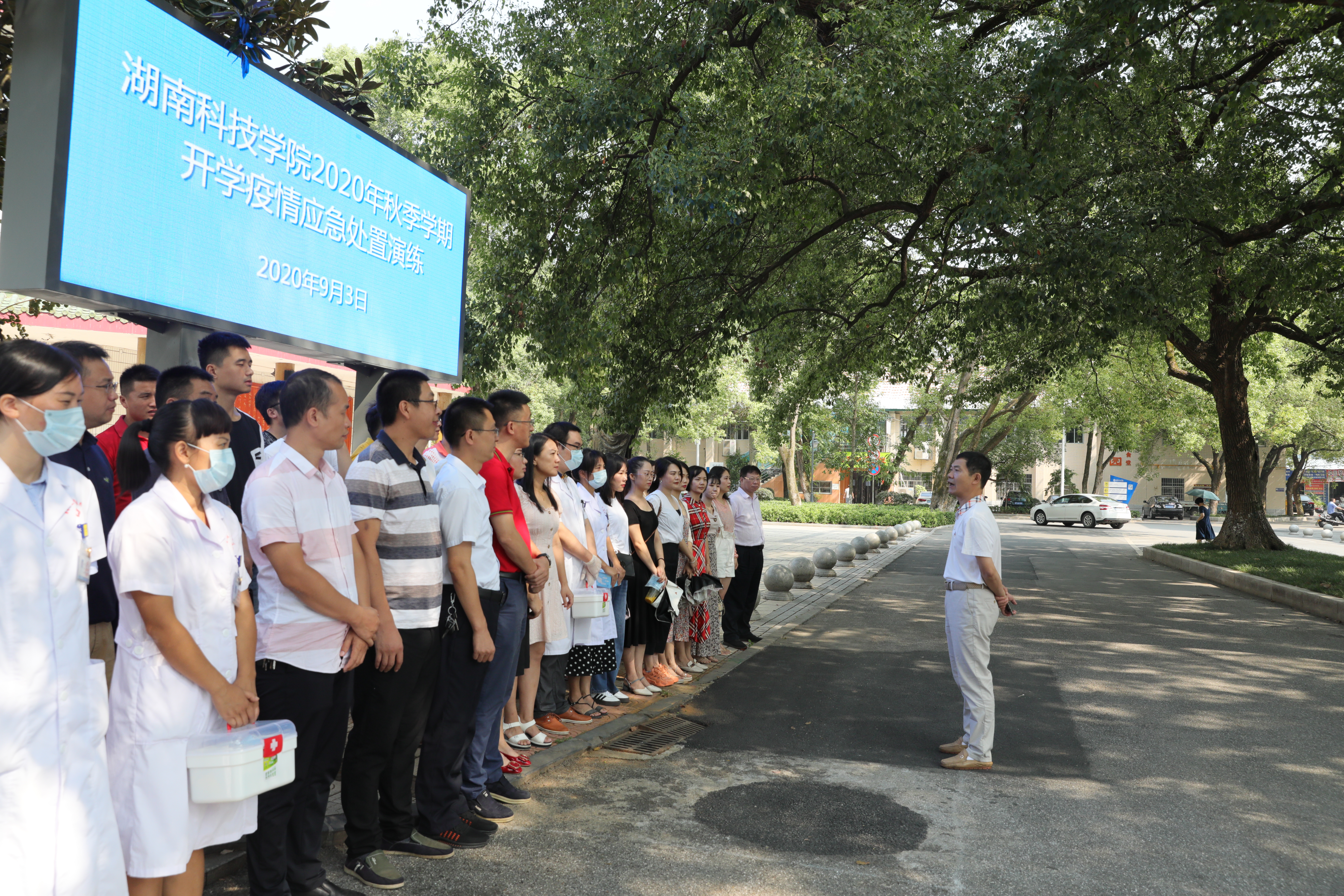 本网讯 9月3日上午,学校举行秋季学期开学疫情应急处置演练,全程、全方位模拟学生返校当天及返校后在校期间的日常学习、生活等相关工作流程,以及学生出现发热和可疑症状时应急处置。副校长吴小林到场观摩指导。