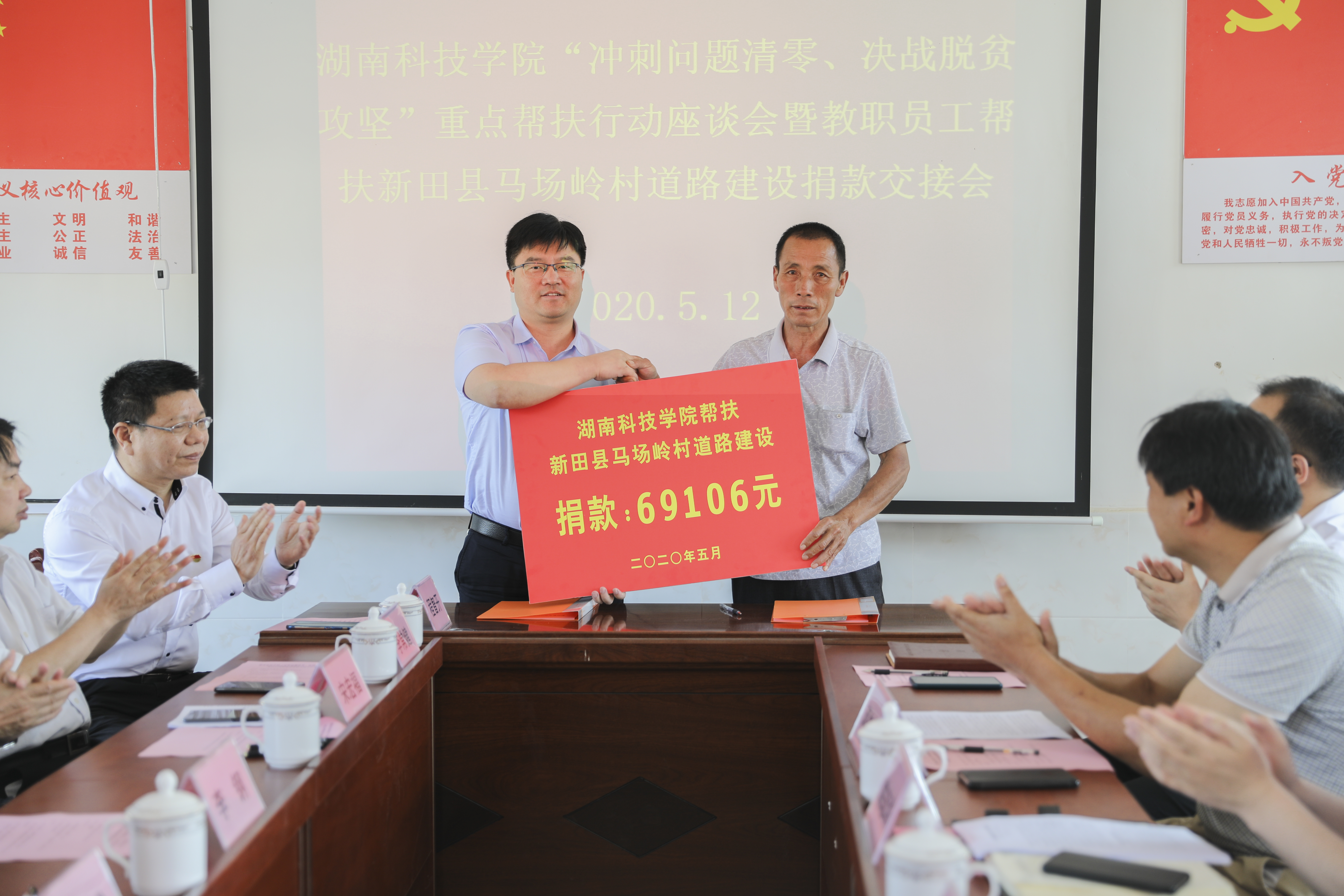 当天上午,教职员工帮扶马场岭村道路建设捐款交接仪式在该村村委会办公楼举行,李钢代表学校将教职员工捐赠的69106元“帮扶资金”交到了村支书手中,用于马场岭村的道路建设。