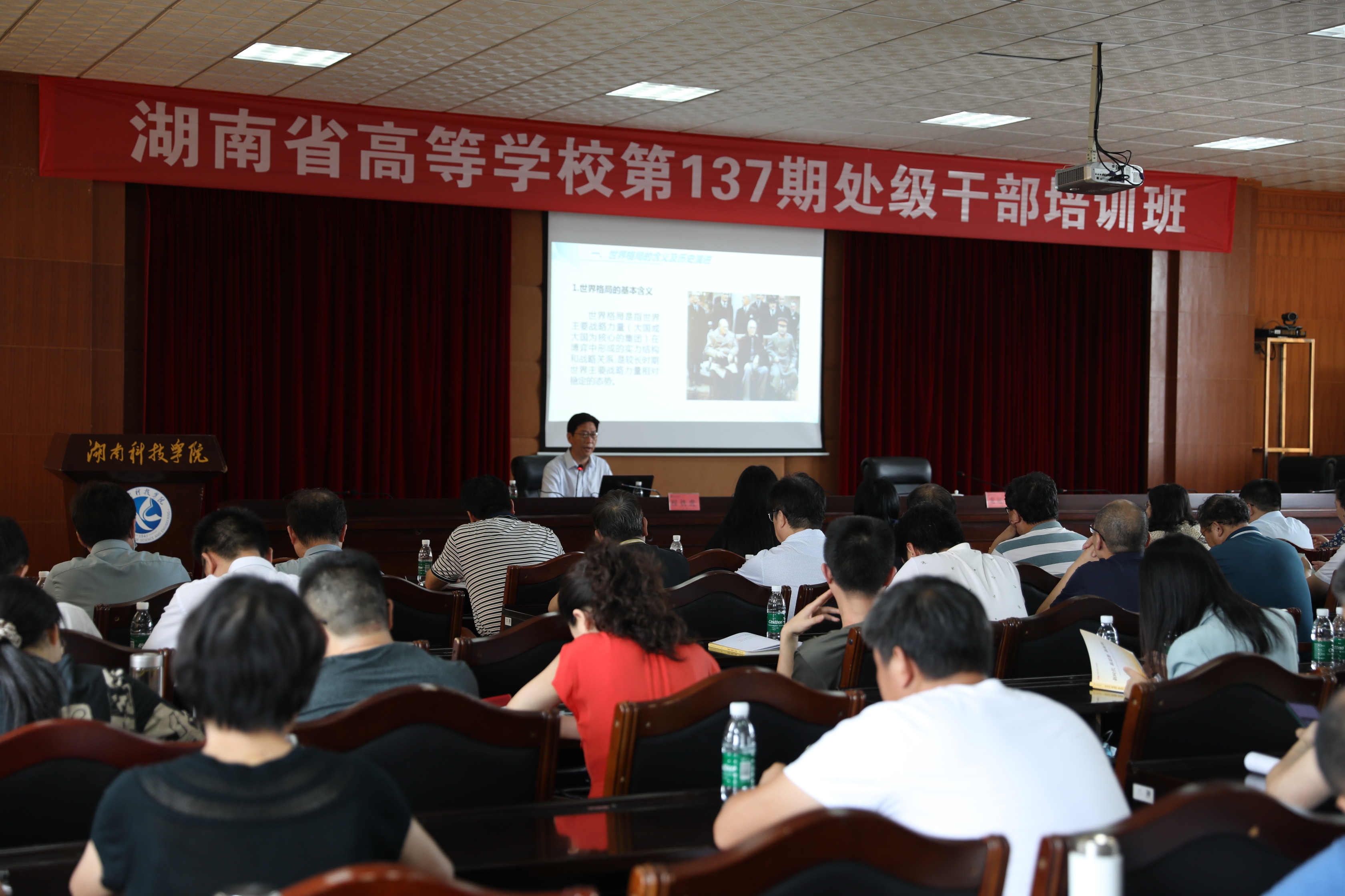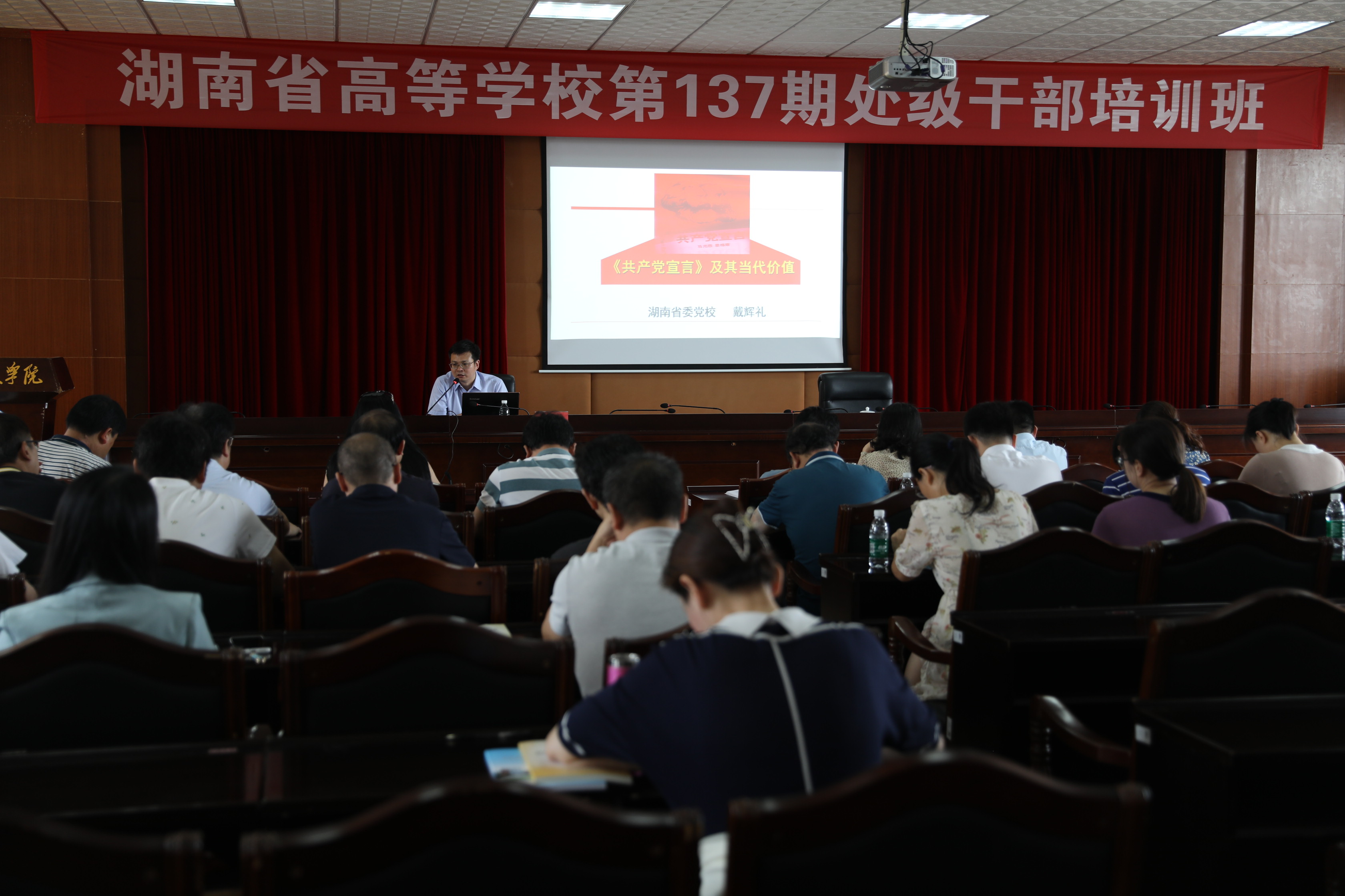 本网讯 6月10日,湖南省高等学校第137期处级干部培训班第十、十一次理论讲座开讲,湖南省委党校科学社会主义(政治学)教研部副主任戴辉礼、湖南省委党校教务部主任程铁虎教授为学员讲授了《共产党宣言》的当代价值、世界格局新变化与新时代中国对外战略。