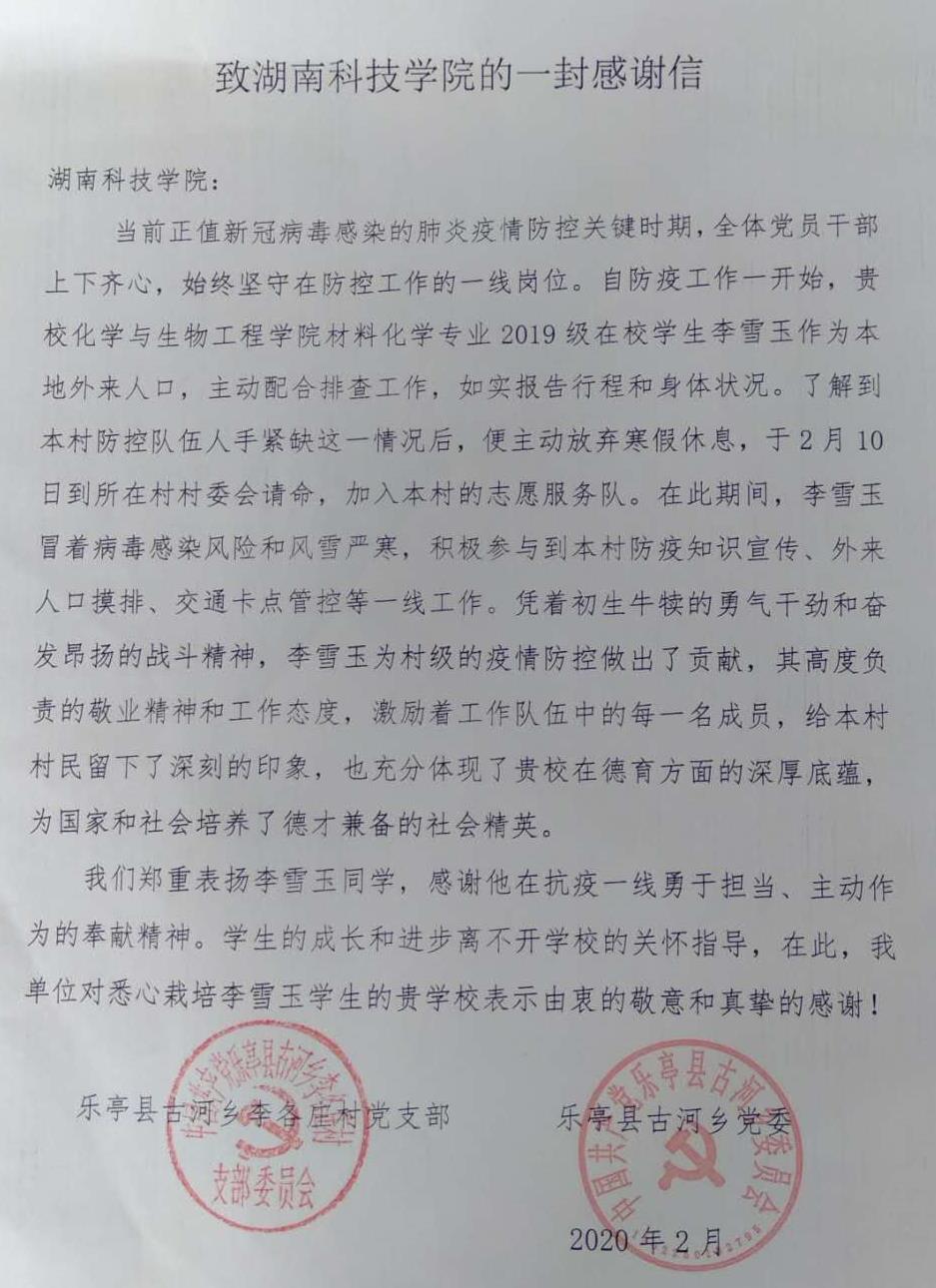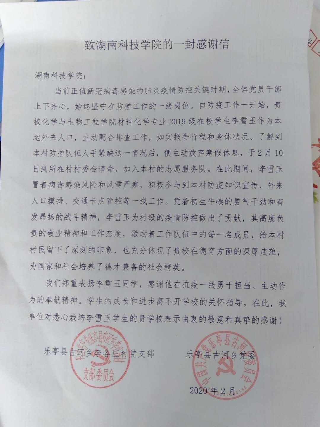 本网讯 日前,我校收到唐山市乐亭县古河乡党委发来的一封感谢信,感谢我校化学与生物工程学院材料化学专业2019级李雪玉同学,勇担使命、担当尽责,为家乡联防联控工作做出积极贡献,让青春在战“疫”中绽放。