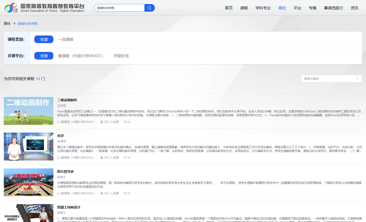 本网讯(通讯员 代军垒 郭宜娟)近日,国家高等教育智慧教育平台正式上线,在首批上线的课程中,我校有34门优质课程入选,覆盖了我校8个学科34个专业类。在湖南省入选的32所地方高校中,我校入选课程门数数量排名第九,除大学外,学院高校入选门数数量排名第一。