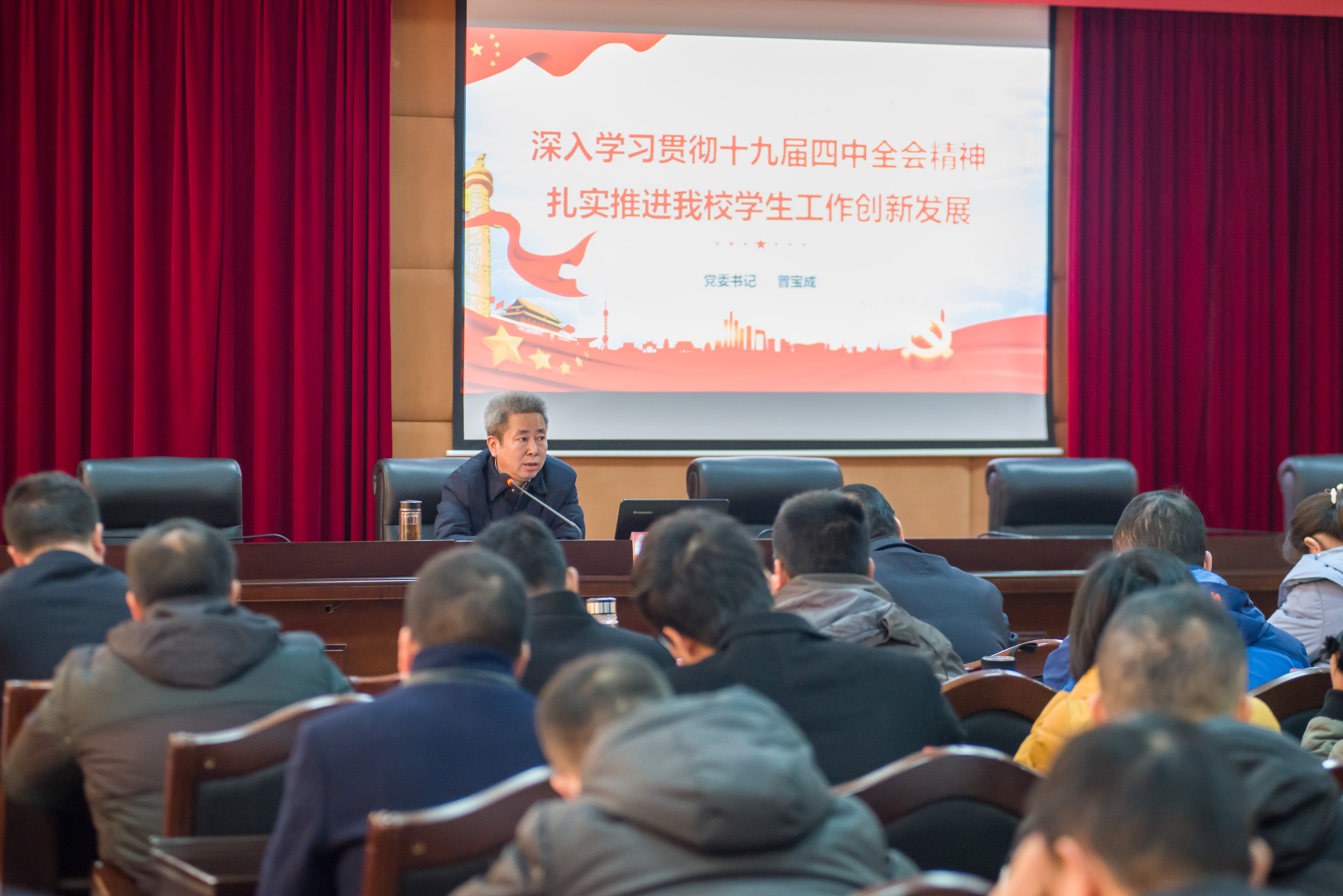 校党委书记曾宝成以《深入学习贯彻十九届四中全会精神,扎实推进我校学生工作创新发展》为题作培训第一讲。他从十九届四中全会的重大意义、基本内容、十三个方面“显著优势”、总体目标、十三个坚持和完善以及重大战略任务六个部分入手,与全体学工队伍一起系统而深刻地学习了十九届四中全会精神。他指出,落实立德树人根本任务,必须抓住理想信念铸魂这个关键、构建多方协同的育人格局、创新学生工作的方式方法、提升学生工作的科学化水平、营造浓厚的校园文化氛围、发挥党组织的战斗堡垒作用和共产党员先锋模范作用。