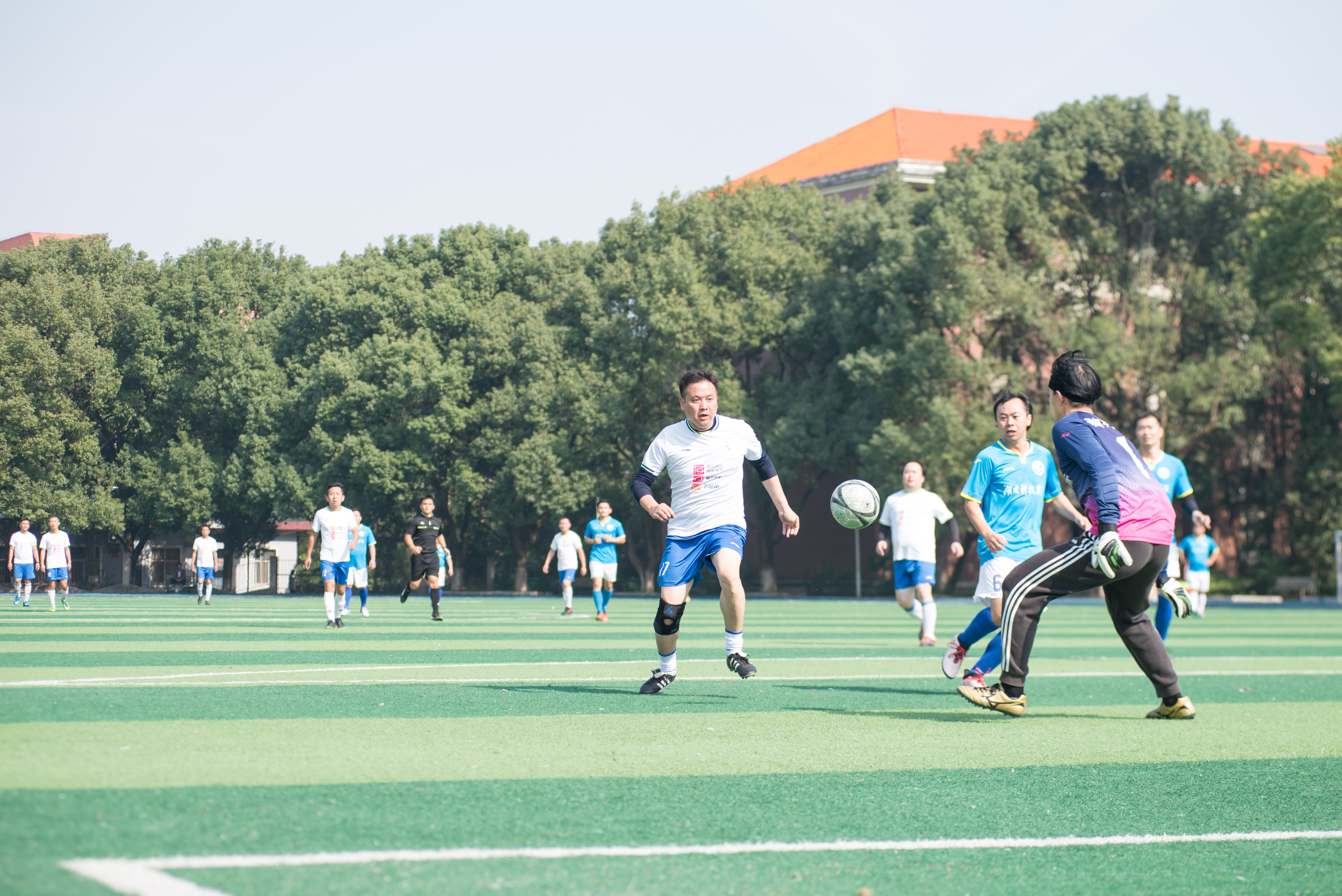 本网讯 11月24日,湖南文理学院教职工足球队一行14人来校交流,与我校教职工足球队进行了一场足球友谊赛。校长李钢、副校长程智开参加比赛,党委副书记、工会主席唐艳明到场为比赛开球并观赛。