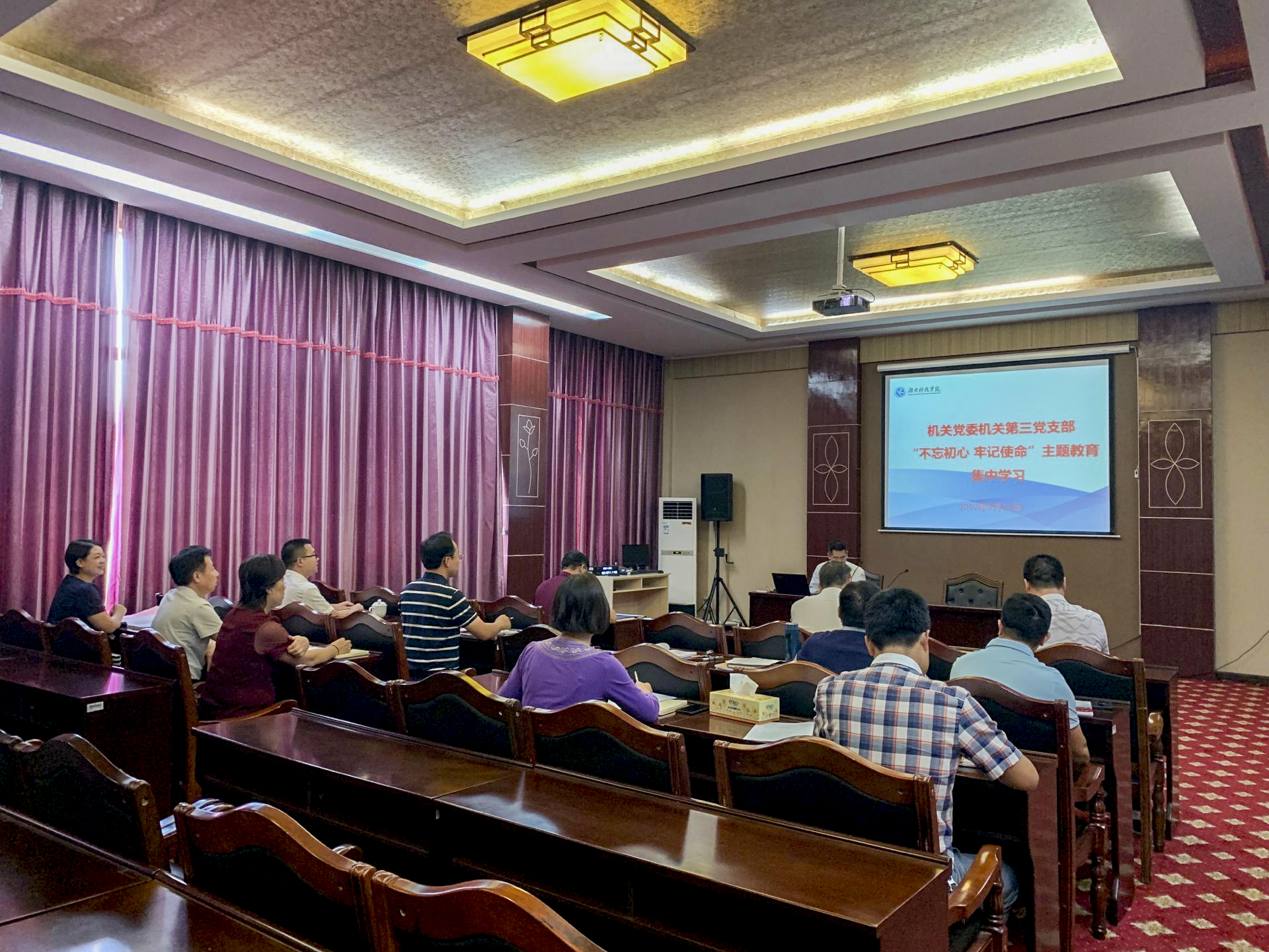 突出抓好“关键举措”,以三会一课为载体,推动学习形式多样化。通过处级干部领学、支部分头学等形式,认认真真学原著、读原文、悟原理,将学习贯穿主题教育全过程。各支部认真落实“三会一课”制度,扎实开展主题党日,充分利用“学习强国”、红星云等学习平台开展学习教育。全体党员、干部瞻仰陈树湘烈士纪念园、李达故居、陶铸纪念馆,书写入党誓词,观看影片《我和我的祖国》、廉政教育片《初心》和《迷失的初心》,聆听微党课“铁血逐梦,断肠明志”,全体党员、干部接受一次次深刻、生动的革命传统教育、形势政策教育、先进典型教育和警示教育。