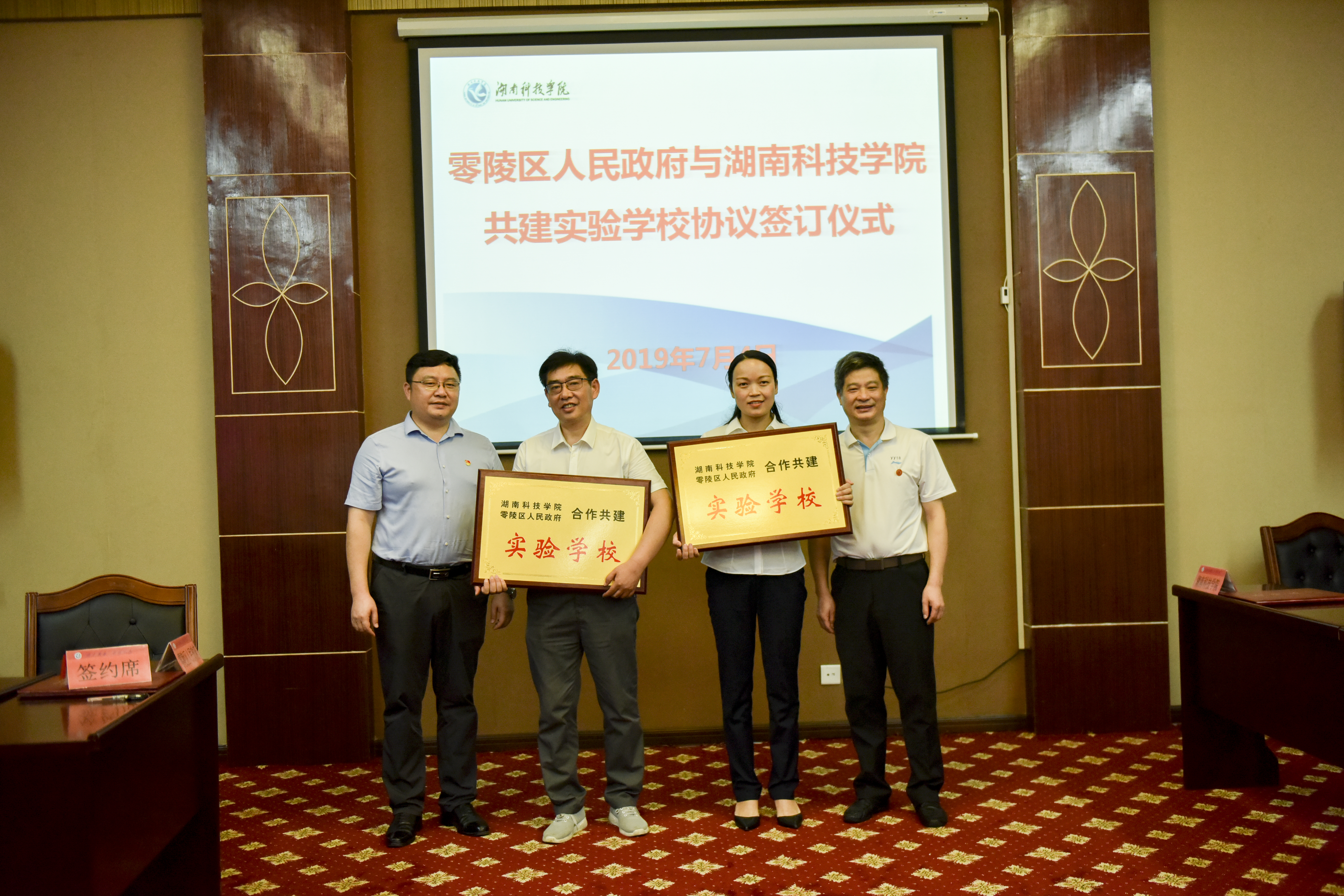 李常健代表学校、张国材代表零陵区人民政府现场签订共建实验学校协议。唐艳明、张国材分别为零陵区杨梓塘小学、永州九中授予“零陵区人民政府、九游在线共建实验学校”的牌匾。