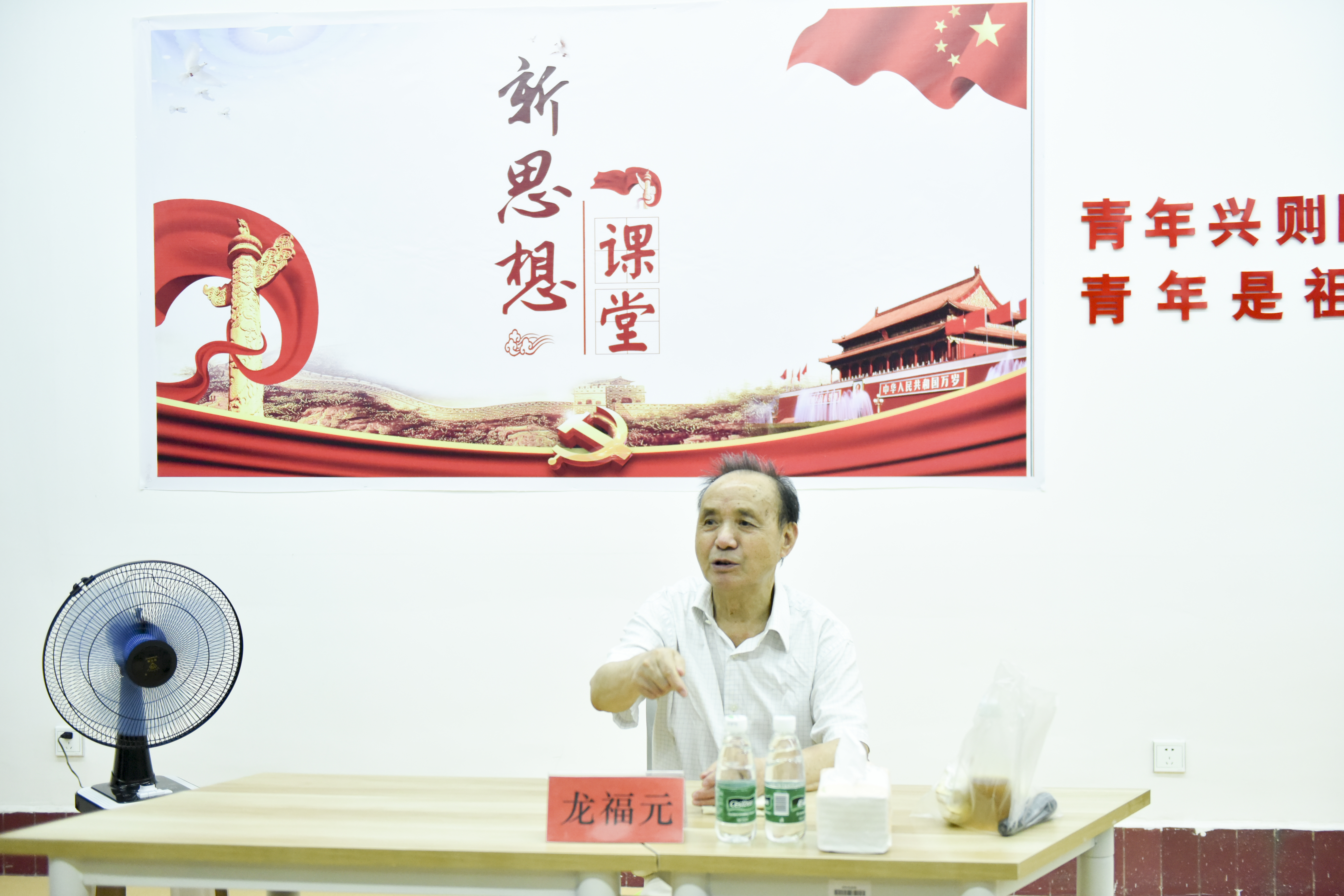 本网讯 6月25日晚,在学校东大门二楼的“新思想课堂”,来了一位特殊主讲嘉宾——学校84岁退休教师龙福元,他主动义务前来为青年大学生开展 “成才之路”的主题宣讲,马克思主义学院部分师生和习近平新时代中国特色社会主义思想研究与实践协会全体同学一同现场聆听。