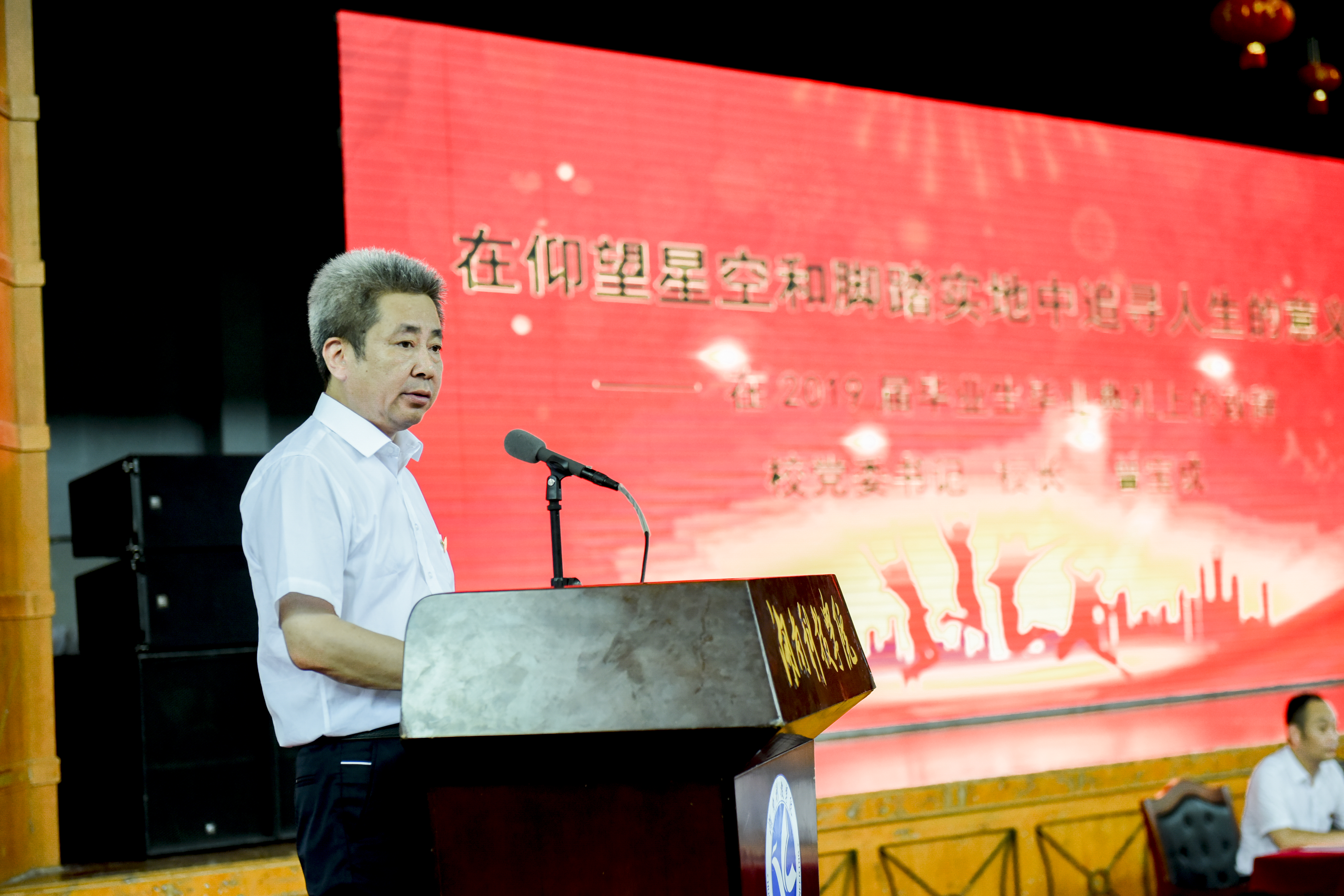 第一个问题是“我们想成为怎样的自己?”今年是新中国成立70周年,是五四运动100周年。你们无疑是幸运的,毕业于这个具有特殊意义的年份。100年前,无数进步青年为拯救民族危亡、捍卫民族尊严、凝聚民族力量,义无反顾的投身那一场伟大的社会革命运动中,以磅礴之力鼓动起了中华民族复兴的志向和信心。继而,越来越多的中国先进分子集合在马克思主义的旗帜下,用共产主义信仰引领起中华民族复兴的伟大征程。今日之后,你们或将进入高校继续深造,或将进入部队接受磨砺,或将进入社会就业创业,但无论是哪一种,首先要立志做最好的自己,继承中国青年“永久奋斗”的传统,将个人梦想主动融入到实现中华民族伟大复兴的中国梦中去,以“自信人生二百年,会当水击三千里”的勇气书写无愧于时代的青春之歌和精彩人生。