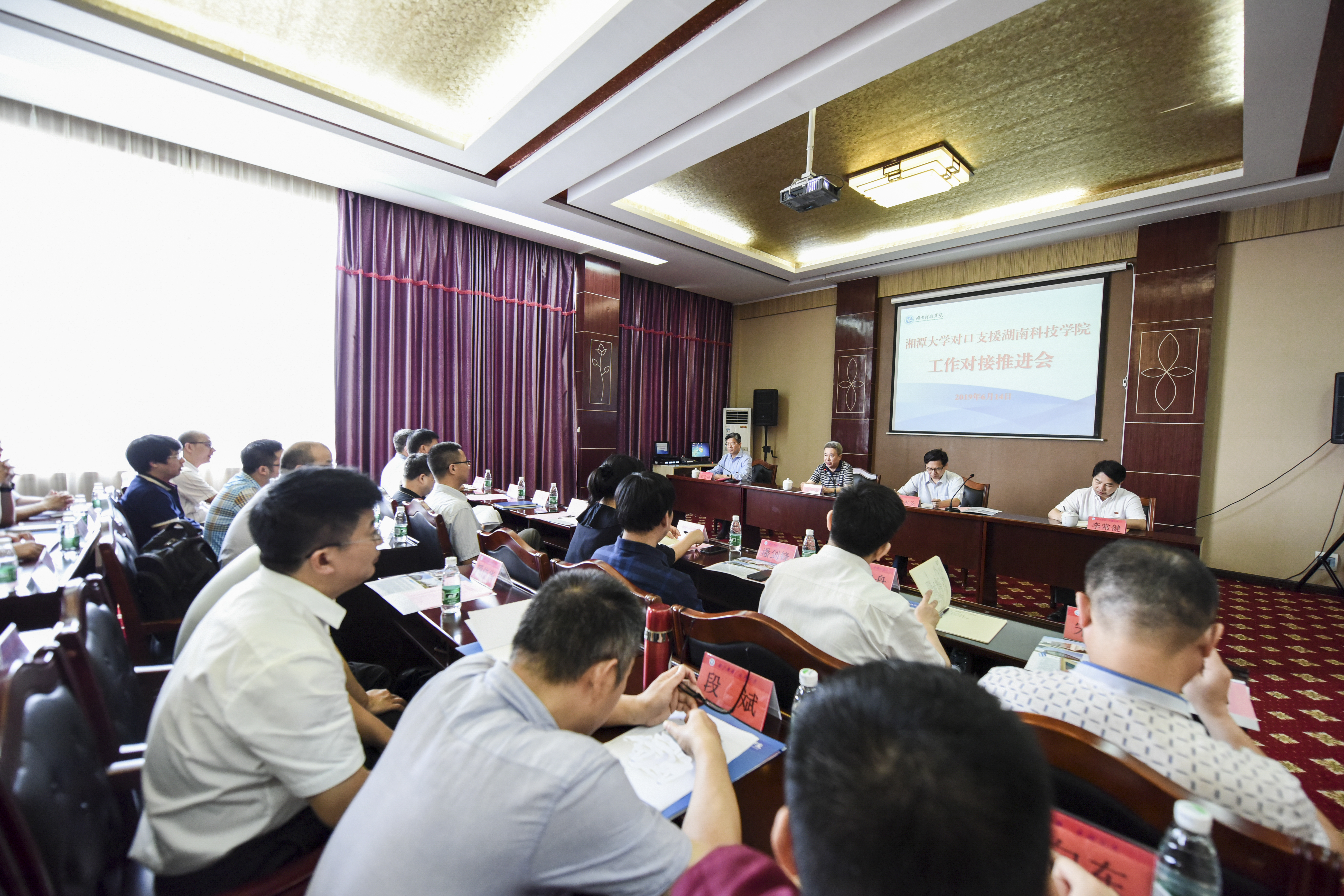 本网讯 6月14日上午,湘潭大学来校开展对口支援工作。党委书记、校长曾宝成,湘潭大学党委委员、副校长廖永安,我校副校长宋宏福、李常健,学校各教学学院、各职能部门负责人与来自湘大的16名教学学院和职能部门负责人参加工作对接推进会,会议由宋宏福主持。