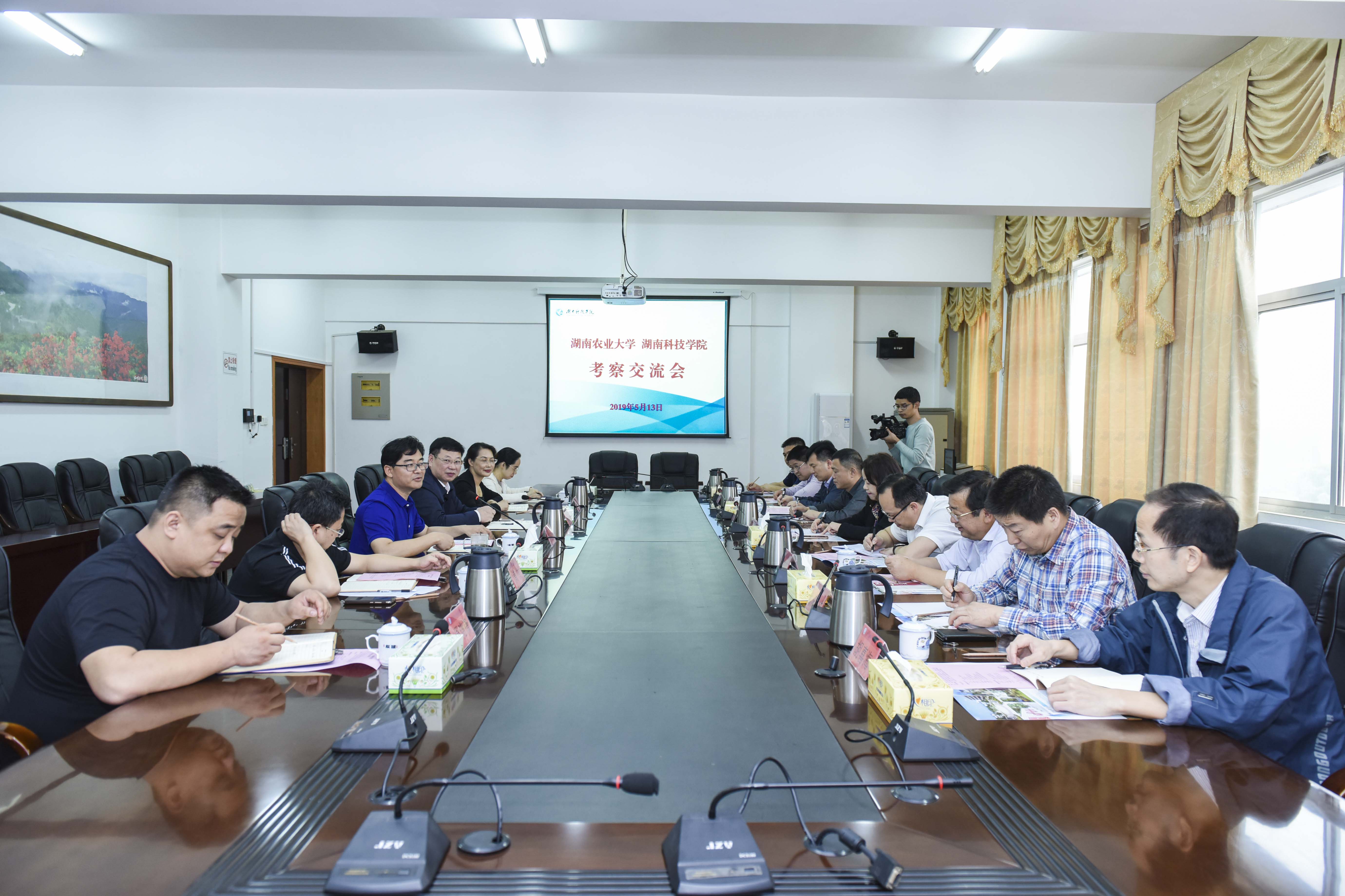 本网讯 5月13日下午,湖南农业大学党委委员、副校长张立一行9人来我校进行考察交流,纪委书记彭立威,党政办、教务处、学工部、保卫处、就业创业指导中心等相关职能部门负责人参加交流座谈。