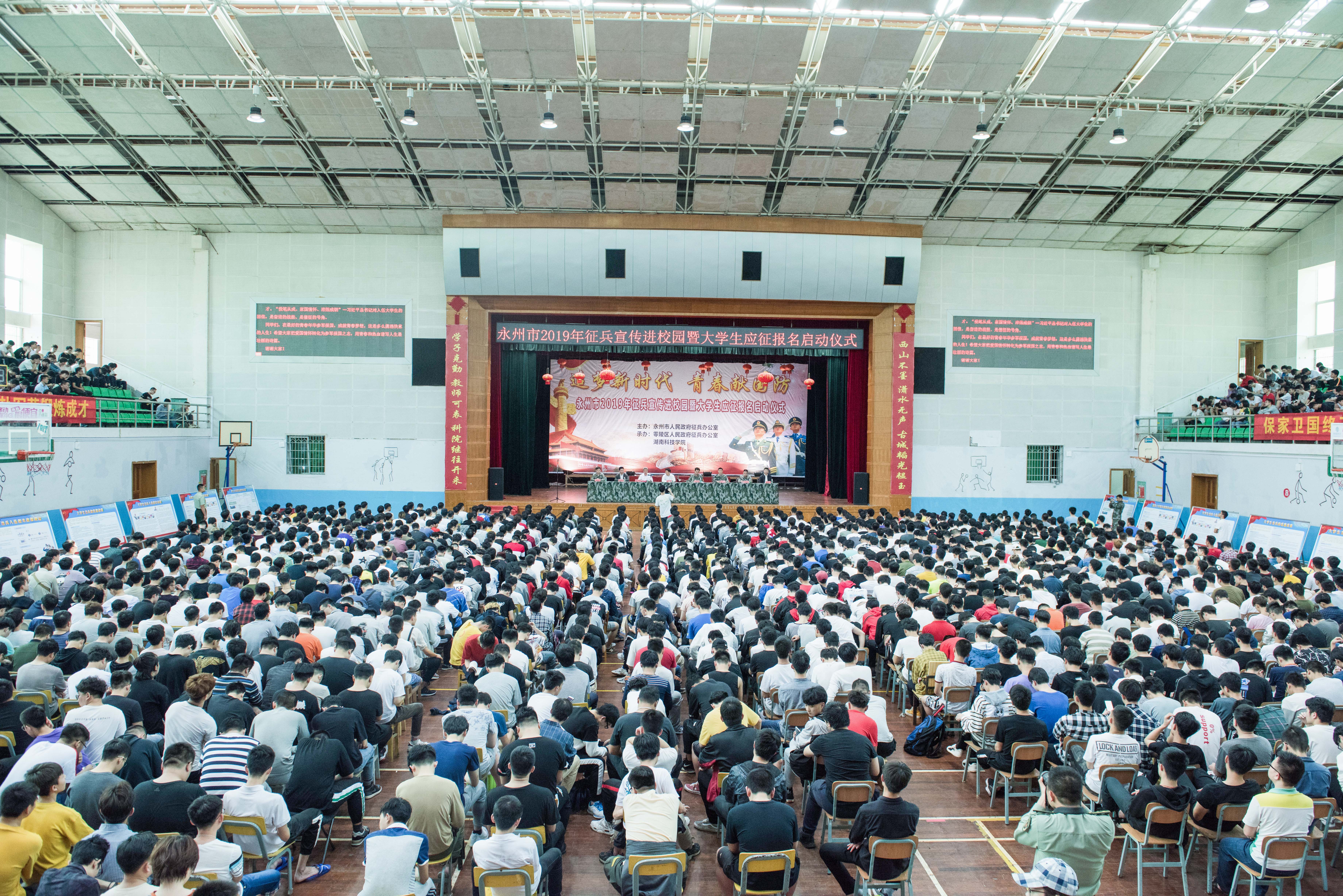 贺辉宣布永州市2019年征兵宣传进校园暨大学生征兵报名正式启动。会后,参会学生积极参与现场签名,咨询征兵工作政策,踊跃地进行现场报名。