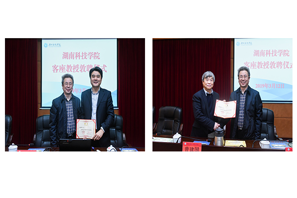 本网讯 3月12日下午,学校举行客座教授敦聘仪式,聘任湖南农业大学柏连阳教授和曾建国教授为我校客座教授,党委书记、校长曾宝成参加仪式并为两位教授颁发聘书。副校长宋宏福及化学与生物工程学院师生代表参加,仪式由宋宏福主持。敦聘仪式后,柏连阳、曾建国应邀分别以《现代农业建设的理论与实践》和《中药资源综合利用与博落回示范研究》为题为师生们作学术报告。