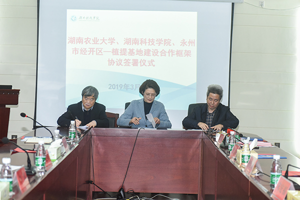 本网讯 3月12日下午,学校与湖南农业大学、永州经开区举行合作签约仪式,共同签订了《湖南农业大学和九游在线科技支撑永州经开区植提基地建设合作框架协议》。湖南农科院党委书记柏连阳教授,湖南农业大学曾建国教授,永州经开区党委副书记、管委会主任李瑛,校党委书记、校长曾宝成,副校长宋宏福,化学与生物工程学院负责人和相关学科团队负责人参加仪式。仪式由宋宏福主持。