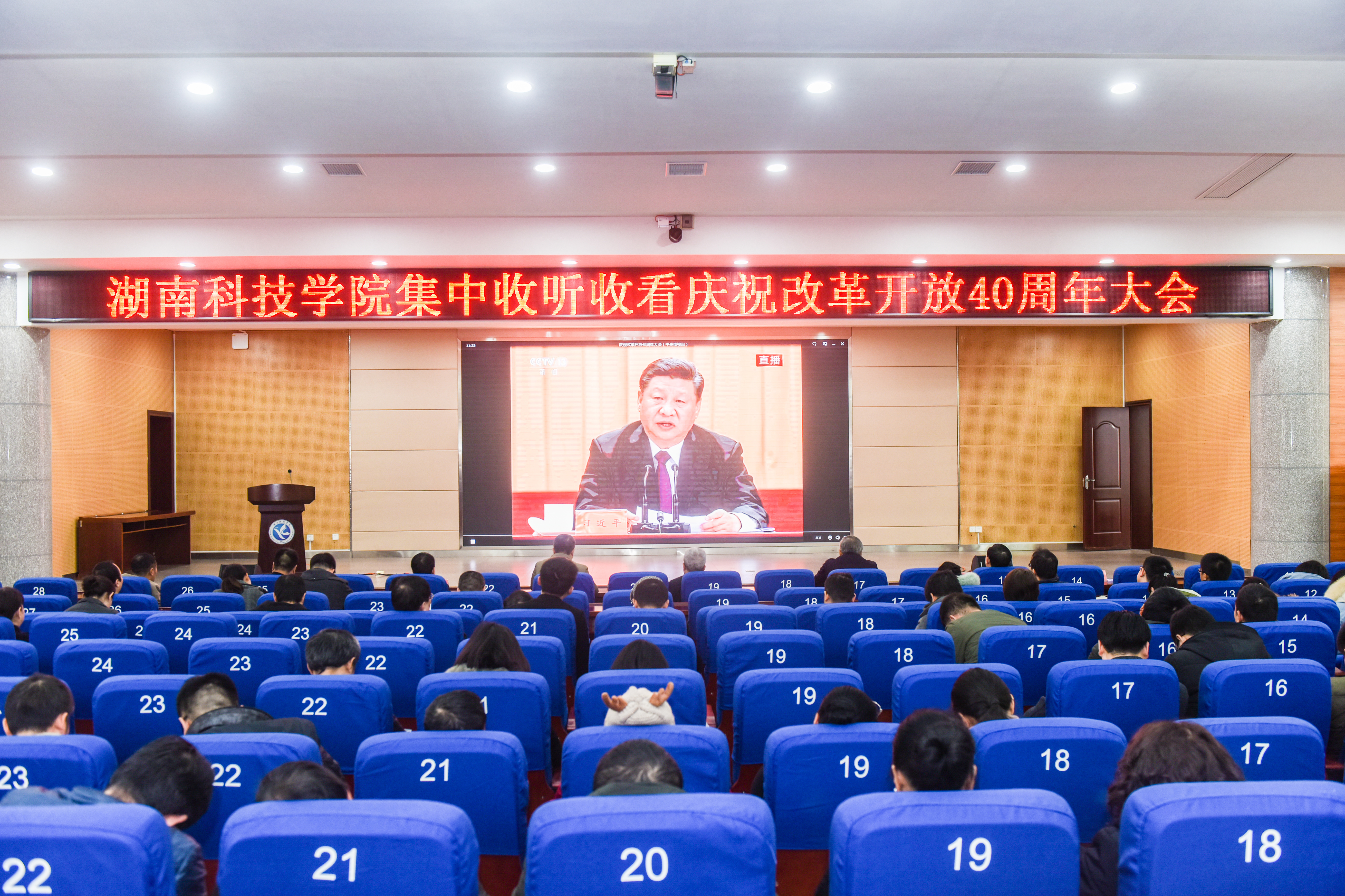 本网讯 12月18日上午10时,庆祝改革开放40周年大会在北京人民大会堂举行。中共中央总书记、国家主席、中央军委主席习近平出席大会并发表重要讲话。为了及时关注大会情况,学校在潇湘大讲堂设立主会场,各学院设立分会场,组织师生们集中收看庆祝改革开放40周年大会直播盛况。校领导曾宝成、唐艳明、宋宏福、郑山明、李常健、吴小林、程智开及师生代表近5000人一同见证了这一历史时刻。