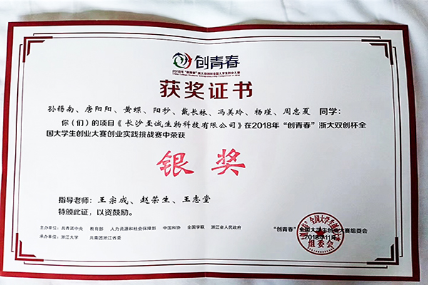 本网讯 11月3日,由共青团中央、教育部、人力资源和社会保障部、中国科协、全国学联、浙江省政府主办,浙江大学、浙江团省委承办的2018年“创青春”浙大双创杯全国大学生创业大赛决赛落下帷幕。经过多轮比拼,我校由王宗成、赵荣生、王志堂老师指导,孙锡南、冯美玲等同学的作品《长沙至诚生物科技有限公司》喜获创业实践赛银奖,湖南省在此次大赛中斩获2金9银33铜,我校成为全省夺银的两所二本院校之一。