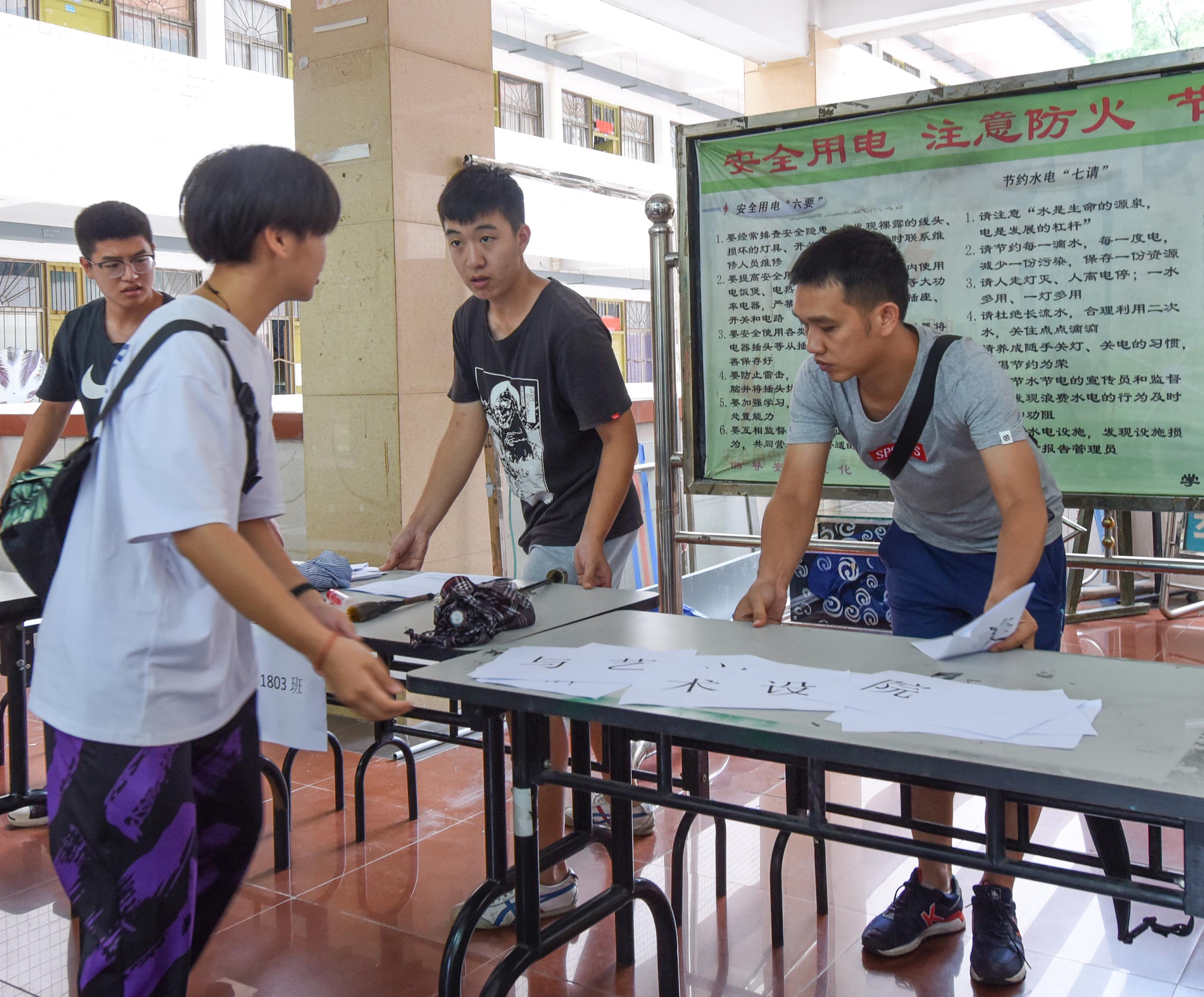 桃二宿舍楼内,辅导员与学生干部一起布置迎新工作点