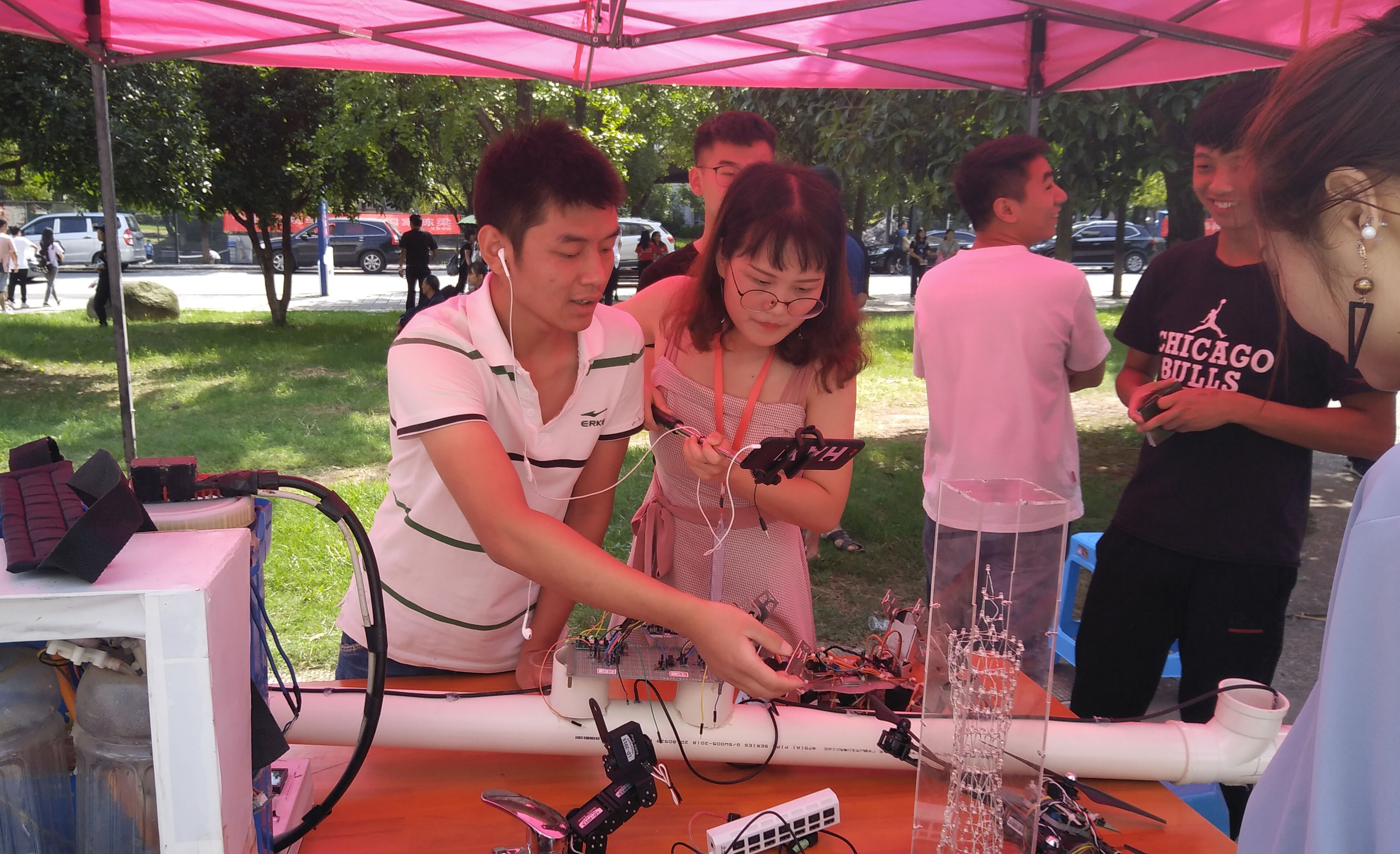 致远楼门口,一群人围聚在一个红色帐篷前,原来是电信院的学生作品展。四旋翼无人机、水下声波速度测量系统、电源变换电路、小蛮腰音乐灯塔等电子作品吸引了学生和家长的目光。负责展示的通信1602班杨鹏同学说,这些作品都是电信院创新创业中心的学生在老师的指导下设计出来的。部分作品还拿过电子设计竞赛湖南省一等奖,挑战杯湖南省二等奖,互联网+创业大赛湖南省二等奖。电信院利用迎新的机会进行作品展示,目的是提高新生对电信院的相关专业学习的兴趣,也让家长对学院的教学质量放心。