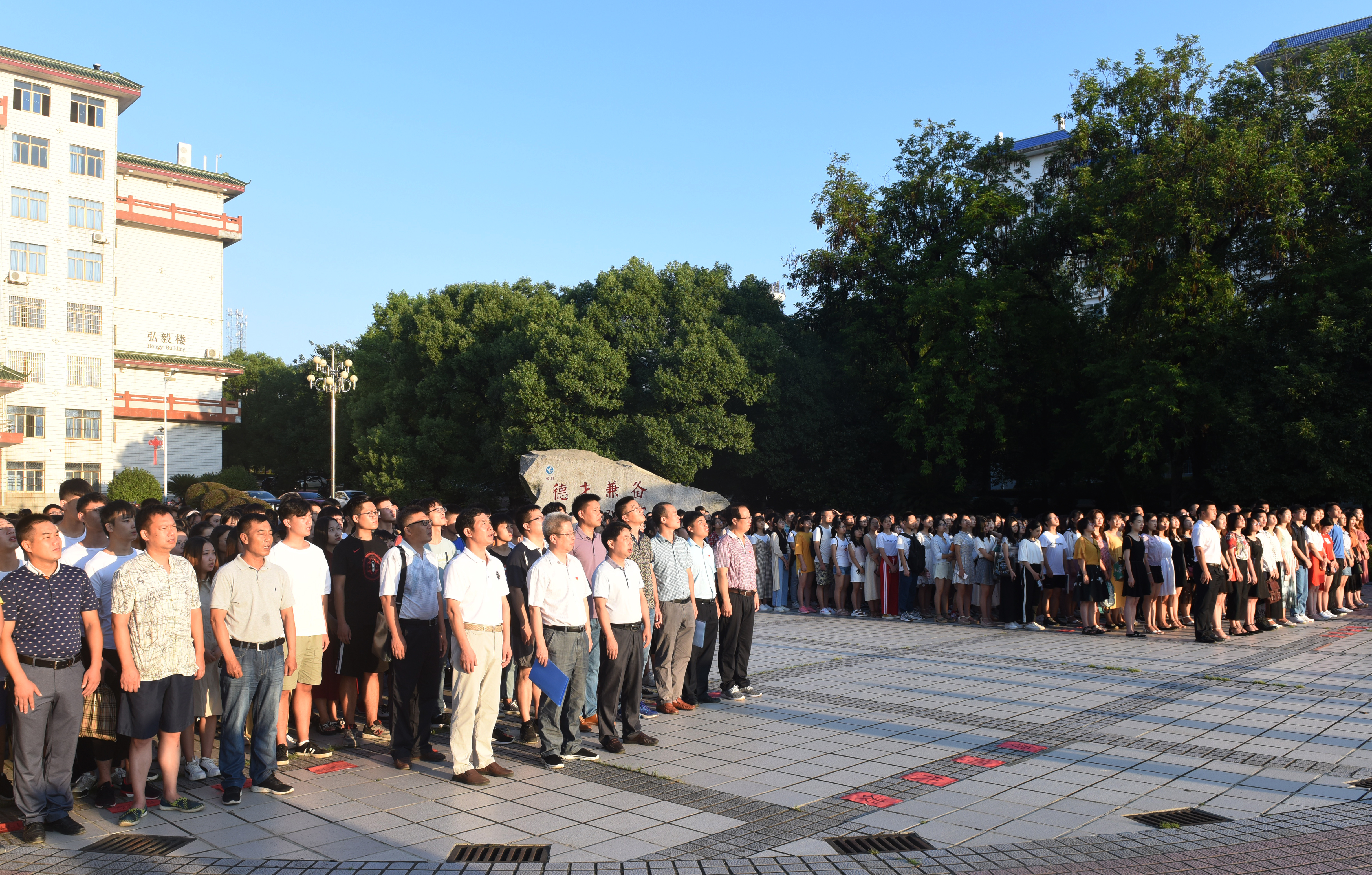 6时50分,英姿飒爽的国旗护卫队迈着整齐的步伐,护送国旗入场,伴随着庄严嘹亮的国歌声,五星红旗冉冉升起,迎风飘扬。在场的师生向国旗行注目礼,深怀着崇敬的心情,凝视着迎风飘扬的五星红旗。