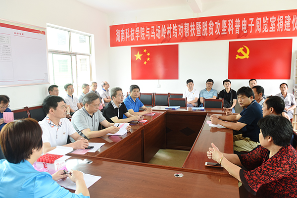 本网讯 6月14日上午,校长曾宝成及校领导唐艳明、郑山明、吴小林带领学校中层干部赴新田县枧头镇马场岭村开展“结对子认亲戚”暨电子阅览室捐建活动,向该村捐赠了20台电脑及电脑桌,总价值八万元,并与该村签订了捐建电子阅览室协议书。