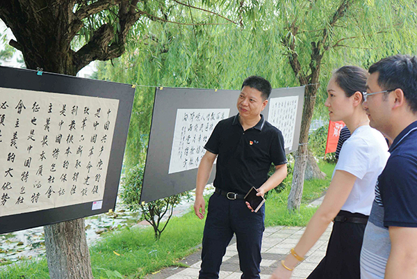 6月19日,由校团委和书法研究所共同举办的“学习新思想,书写新时代”主题书法展在爱莲湖畔成功举行。副校长程智开出席活动,并与书法研究所所长唐幼铎一起对展出的书法作品进行了点评。