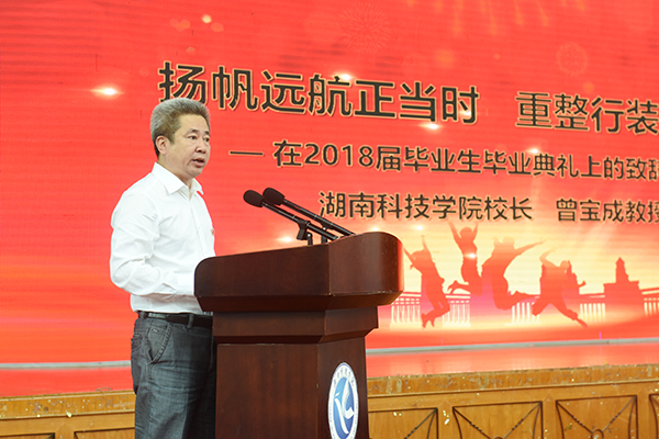 曾宝成作了主题为《扬帆远航正当时 重整行装再出发》的毕业典礼讲话。他深情回忆了同学们四年来的点点滴滴,他也热切关注同学们的成长进步:义务捐献血小板而不留名的王占康同学、自立自强学子龙夏萍同学、在国际重要期刊发表高水平论文的秦源和龚振同学、“美女学霸”黄灿楼、杨柳青青、钟秋华、黄丽、罗培英同学、即将远赴新疆、西藏等基层岗位工作的任英、李广鑫、唐福良同学等等……他说,这些都是满满的青春正能量,为大家点赞。