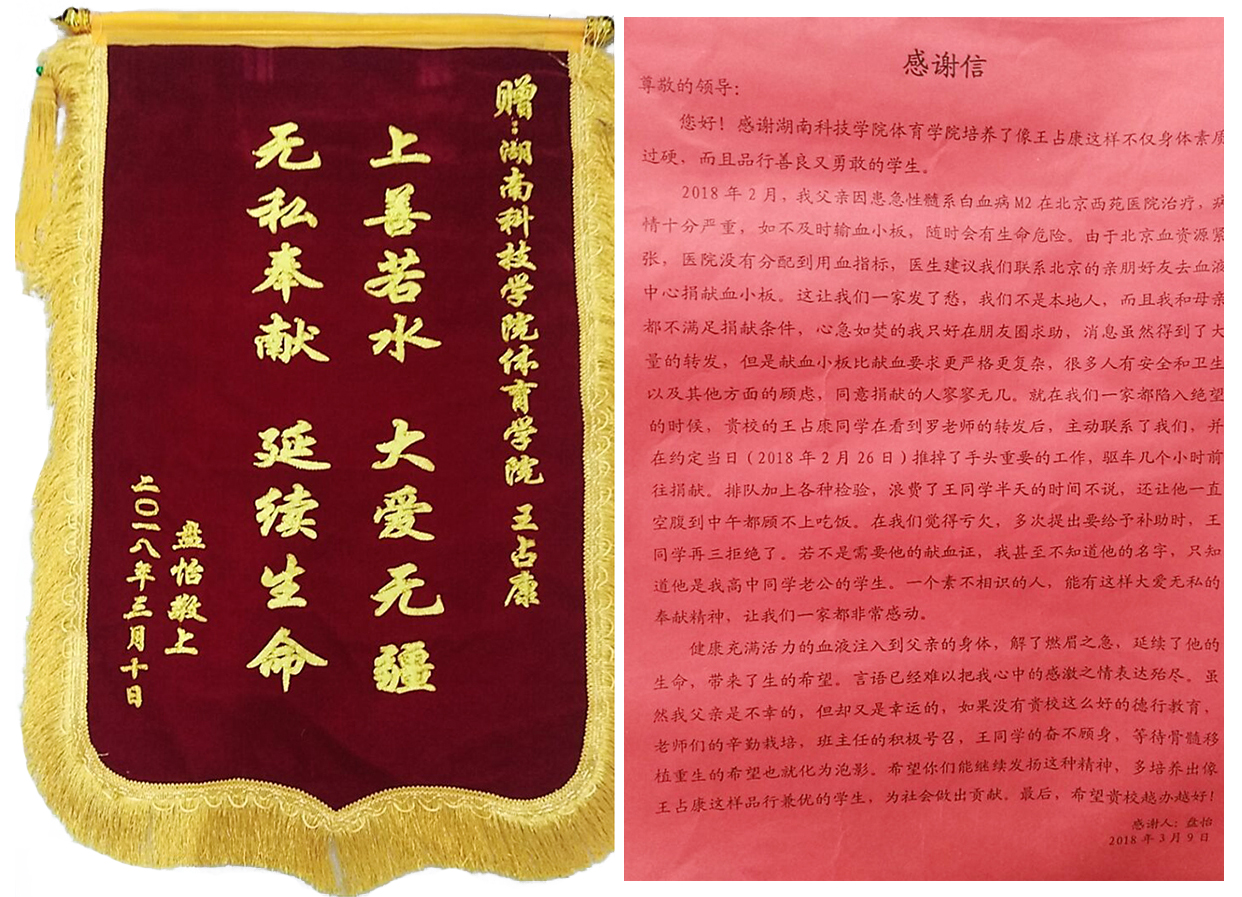 本网讯 日前,一封饱含感激和赞扬的感谢信让春暖花开的校园更添浓浓暖意。我校体育学院体育教育专业2014级王占康同学为病危患者义务捐献血小板,受到患者家属的真诚感谢,王占康同学的爱心义举是新时代雷锋精神的生动写照。