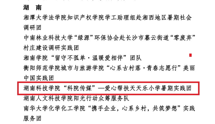另悉,我校“科院传媒”——爱心帮扶天天乐小学暑假实践团队被评为2017年全国大中专学生志愿者暑期“三下乡”社会实践活动“优秀实践团队”。