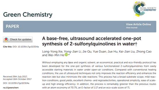 本网讯 近期,我校化学与生物工程学院有机化学博士团队在超声清洗机用于绿色有机合成反应方面取得重要进展,研究成果被Green Chemistry (影响因子:9.125)刊发。这是该研究团队成立后,在该期刊发表的第三篇学术论文。