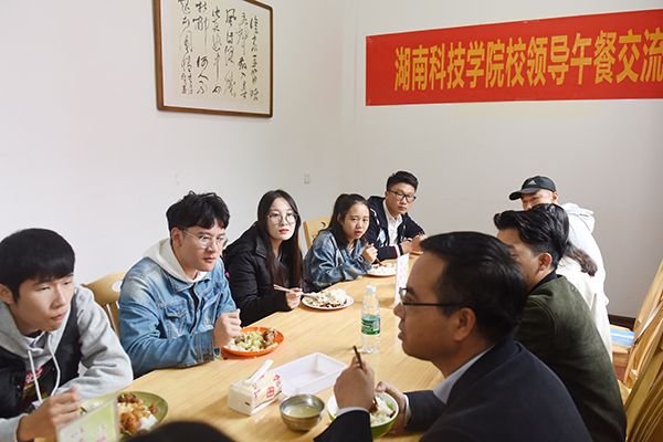 本网讯 “你是老挝的留学生阿雷吧!在学校生活得还习惯吗?能吃辣吗……”11月14日中午,在党委书记陈弘与留学生阿雷亲切地交谈中,我校第一期“校领导午餐交流会”在荷园二楼教工食堂如约而至。15名学生与陈弘围坐一桌,共进午餐,进行了面对面、零距离、轻松愉快的交流。