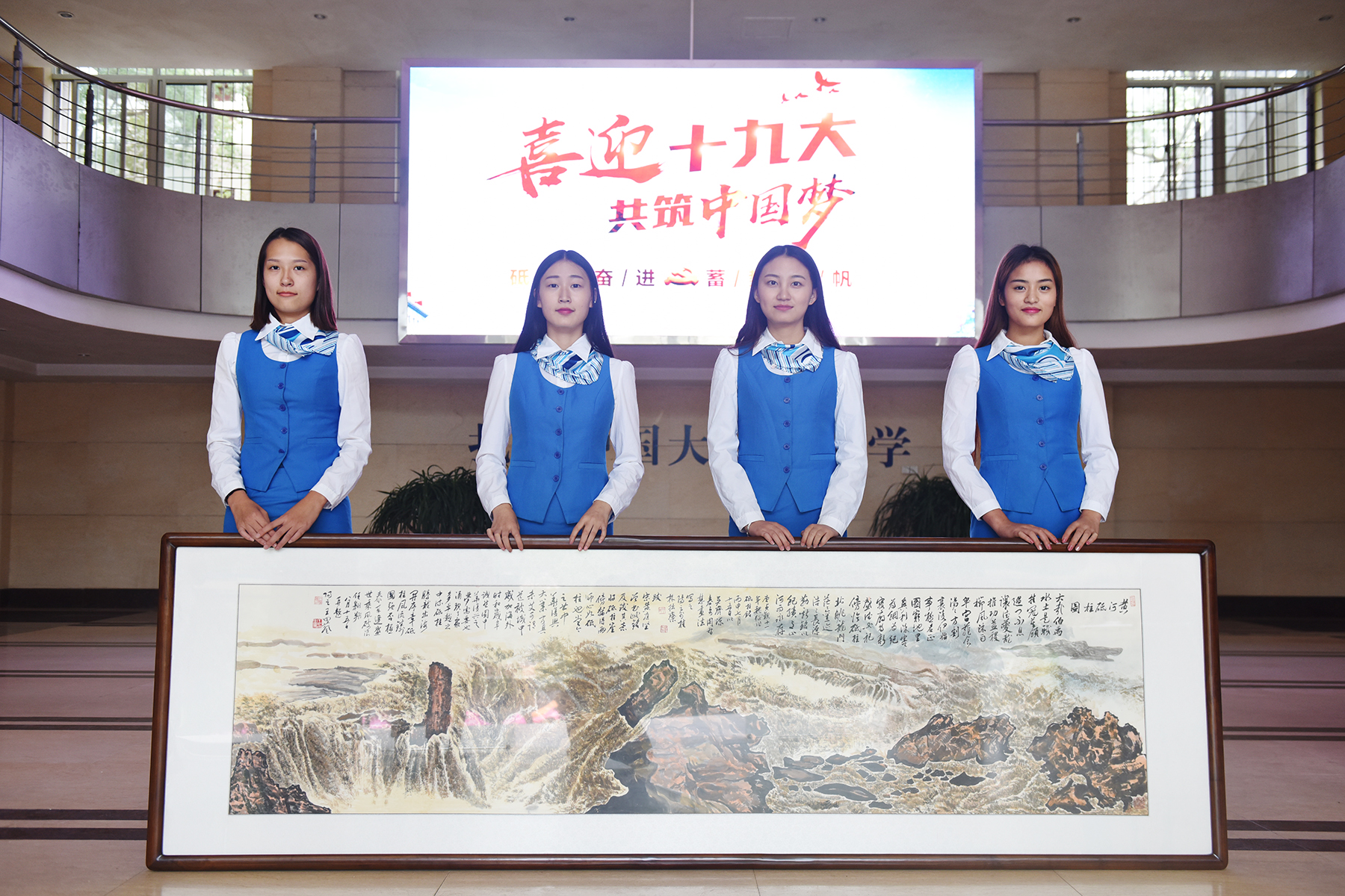 据介绍,这幅长2.8米,宽1米的巨幅画作由我校退休教师王田葵教授历时近半年时间创作完成。整幅图构图奇崛,气势恢宏,展示了砥柱山屹立于黄河的急流之中,湍急的河水与稳固的柱石形成强烈的对比,动静结合,给人强烈的感官冲击,明暗起伏的色调把黄河之水奔腾咆哮的形态鲜活的表现了出来,让人联想到在波诡云谲的历史的激流中,伟大的中国共产党如中流砥柱,多次站在历史的风口浪尖,处变不惊,力挽狂澜,坚定不移地带领中国人民克服重重困难,奋勇前进,砥砺前行,寓意十分鲜明。