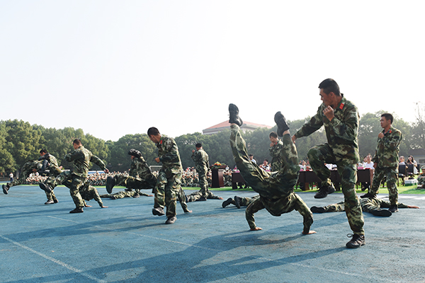 在庄严的国歌声中,开学典礼拉开帷幕。军训教官队列表演、优秀连队队列展示及警体拳表演赢得现场阵阵掌声。